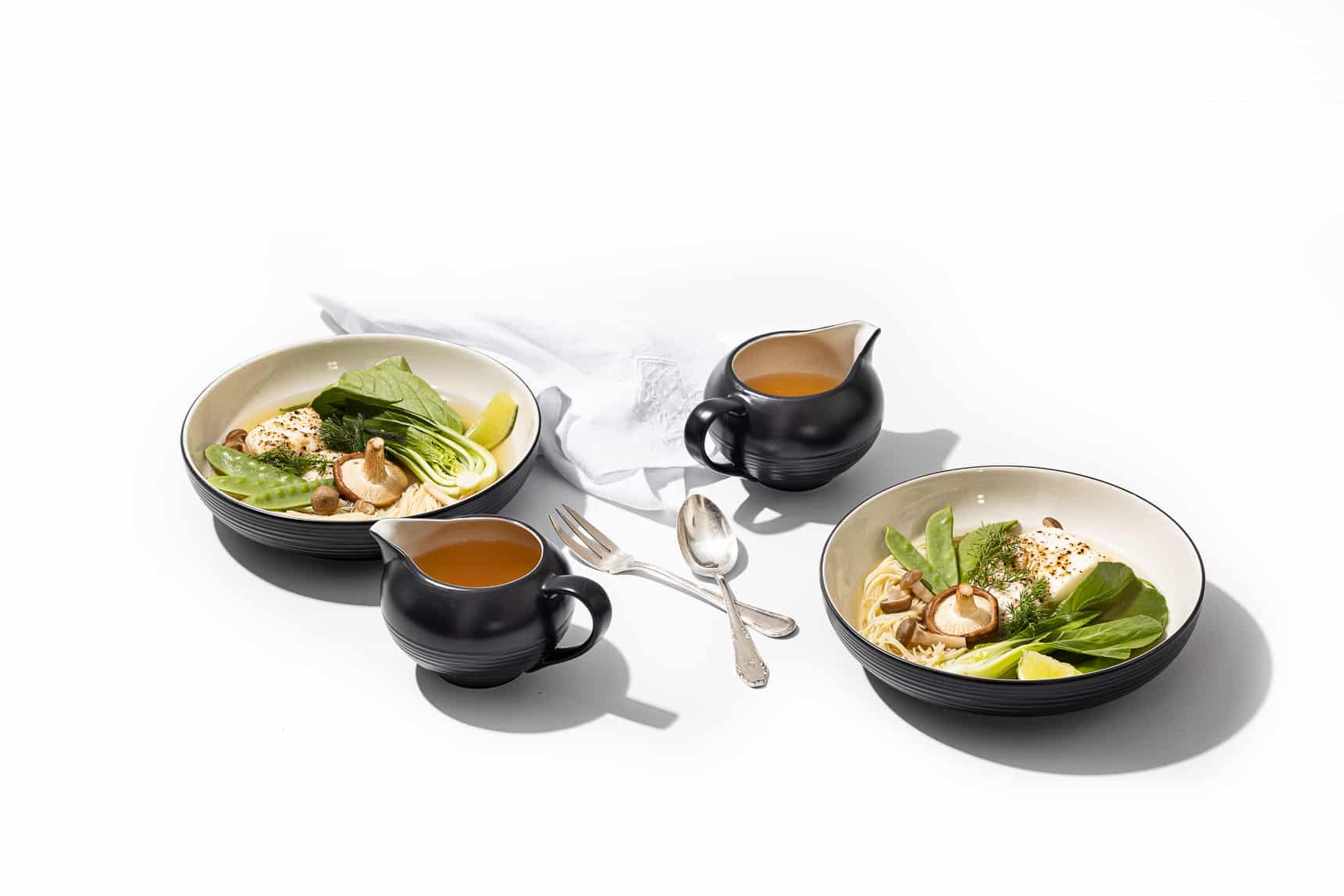 Bring a saucepan filled with water to the boil. Add the noodles and cook for 2 – 3 minutes. Drain in a colander. Bring the broth to a simmer and cook the mushrooms in the broth for 1 minute. Arrange the kingklip, pak choi, mange tout peas and noodles in serving bowls. Pour hot broth over and serve hot with lime and fresh dill.