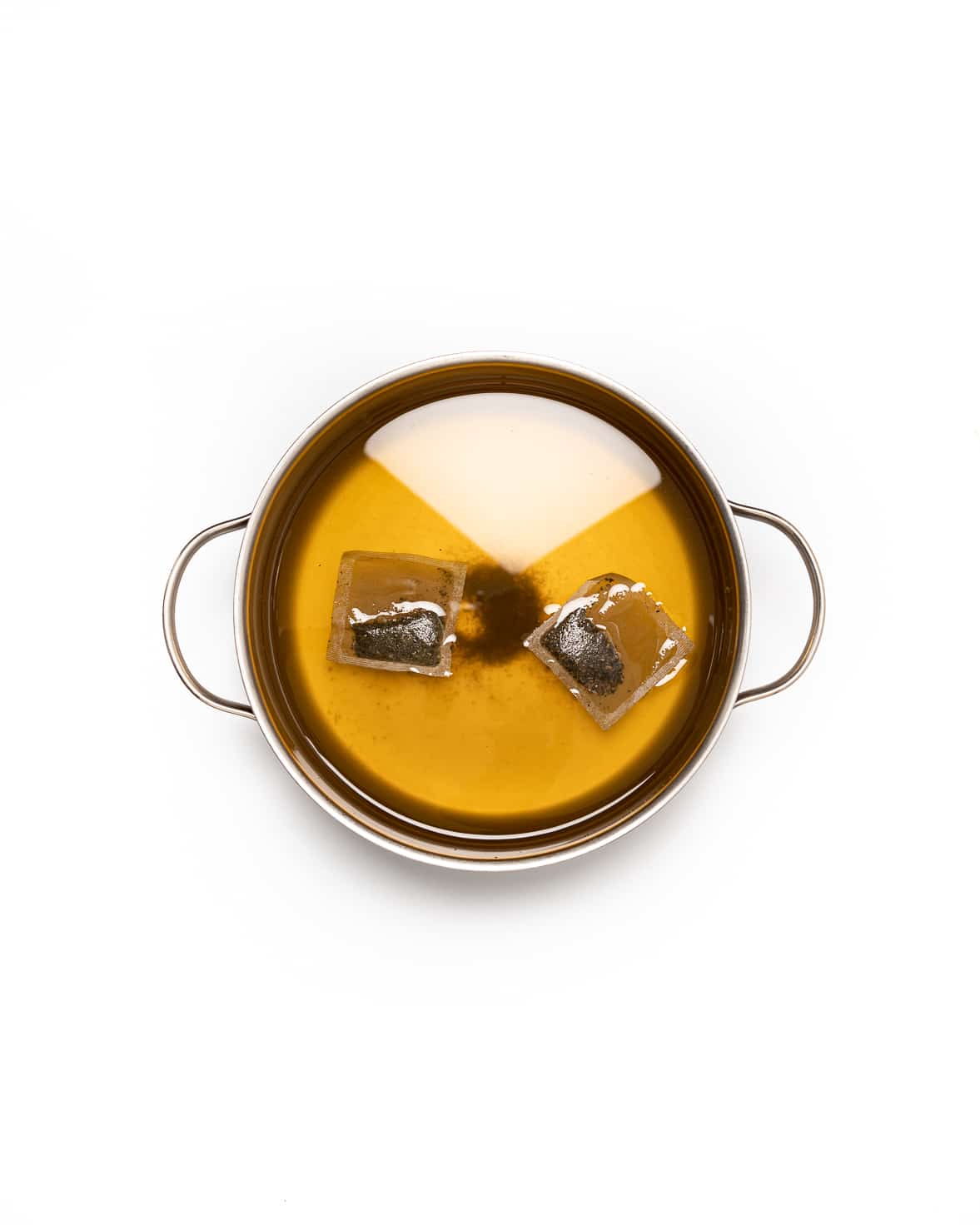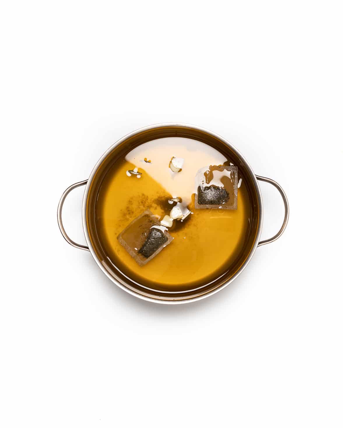 Pour the vegetable stock into a large saucepan. Bring to the boil and add the tea bags and thinly sliced garlic. Let the stock simmer for 10 minutes. Strain the stock through a muslin cloth and pour back into a saucepan.