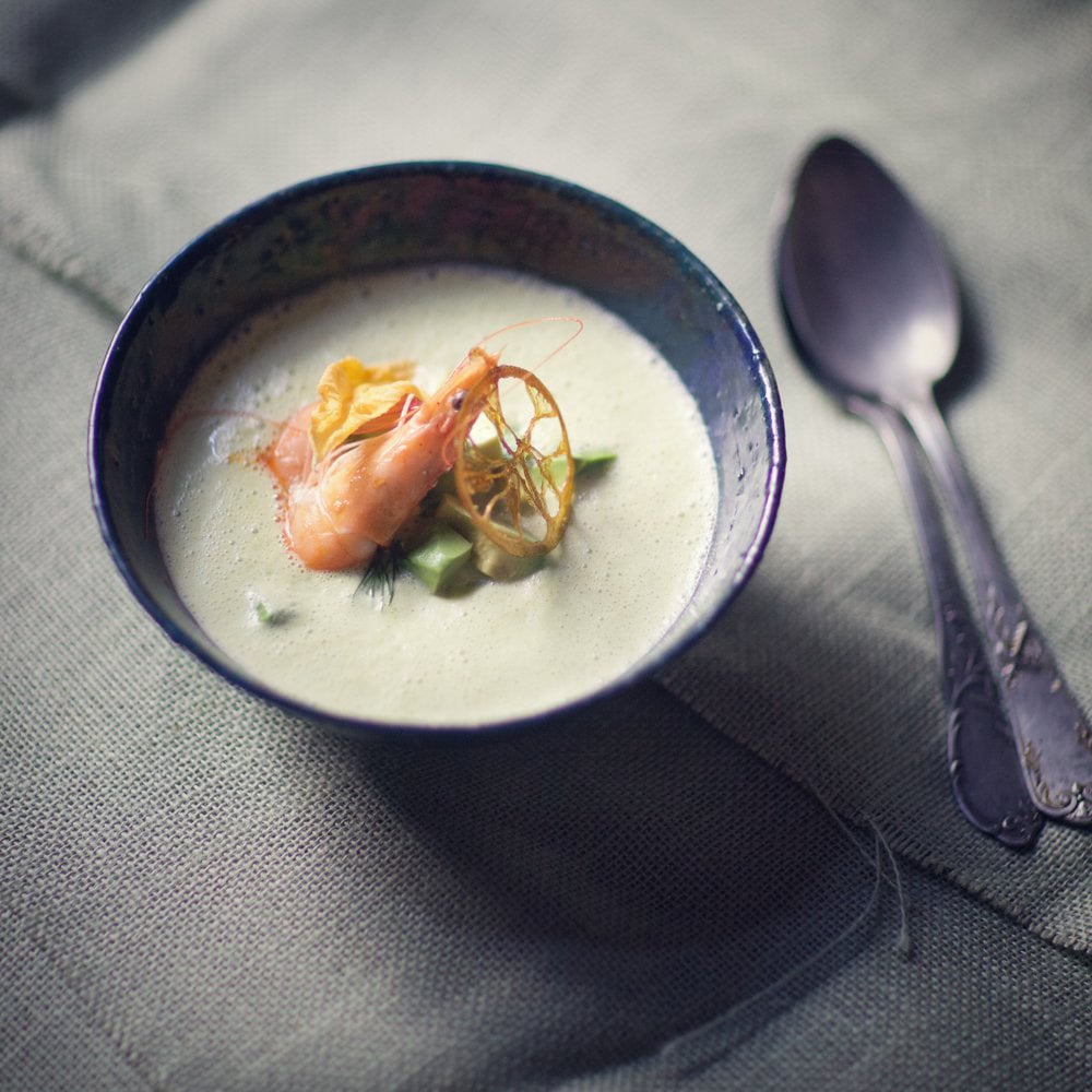 GRILLED PRAWN WITH ZUCCHINI FLOWER, CUCUMBER AND AVOCADO GAZPACHO