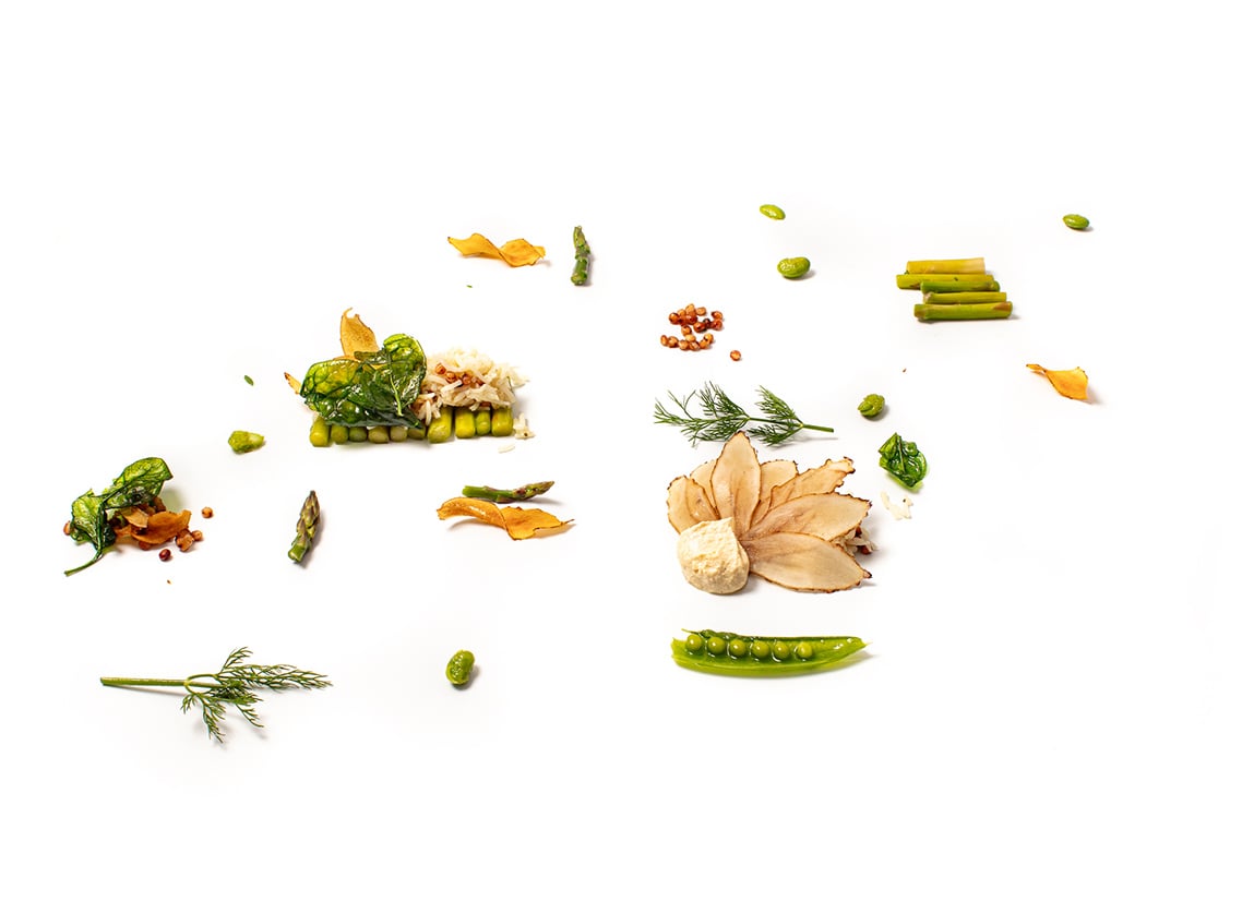 Layer the rice with vegetables, hummus and deep-fried artichokes. Make small dollops of hummus on the plate and add the dill and spekboom.