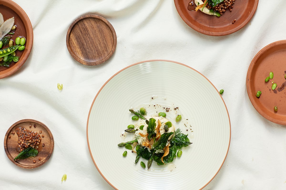 Layer the rice with vegetables, hummus and deep-fried artichokes. Make small dollops of hummus on the plate and add the dill and spekboom.