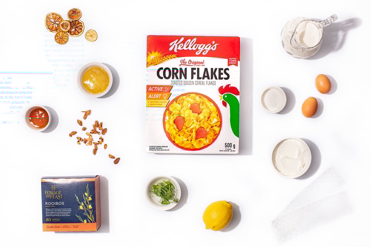 Start by placing six glasses in the fridge on a tray that is level, which will help the milk jelly to set quicker in the cold glasses. In a medium saucepot, bring the milk to a gentle simmer, remove from the heat, add the 150 g corn flakes and teabags and allow to infuse for 5 minutes.
