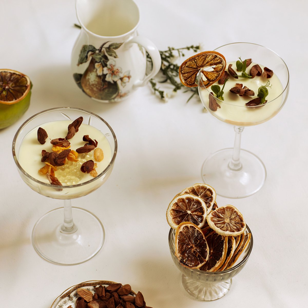 Remove the teabags and strain the milk into a clean pot and slightly heat the mixture again, add the bloomed gelatin sheet into the milk and whisk over a low heat until melted. Remove from the heat and whisk in the honey until melted, use a soup ladle or pouring jug to fill a third of the glass with the jelly.