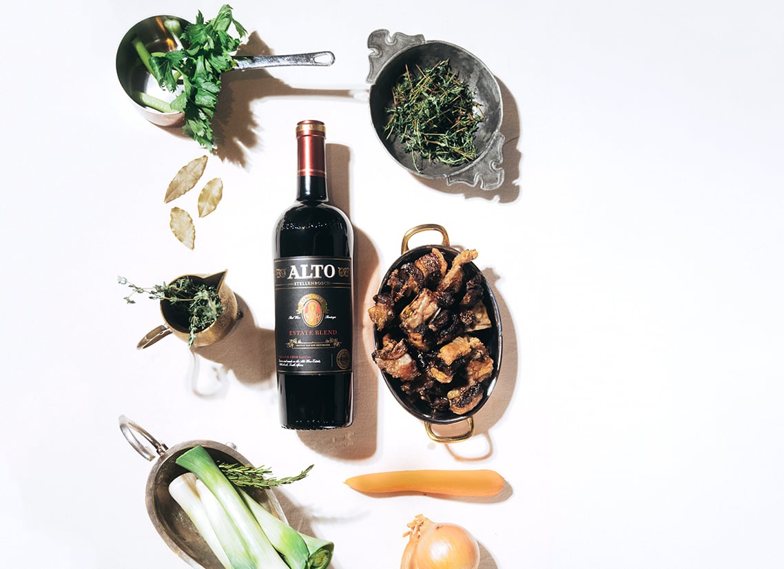 For a truly magnificent stock, I love the Alto Estate Blend 2022. This exceptional vintage – born of a cool growing season following Cape Town’s cold, wet winter of 2021 – allowed grapes to ripen slowly, developing deeply concentrated flavours that translate magnificently into stock-making. The blend’s composition of 60% Cabernet Sauvignon, 30% Shiraz, and 10% Cabernet Franc creates a perfect harmony of structure and flavour. Its intoxicating notes of fynbos, pencil-shavings, and maritime salinity, coupled with its firm, muscular tannins and nuances of black currant, plum, dried fig, and tobacco leaf, infuse a stock with a beautiful complexity and depth.