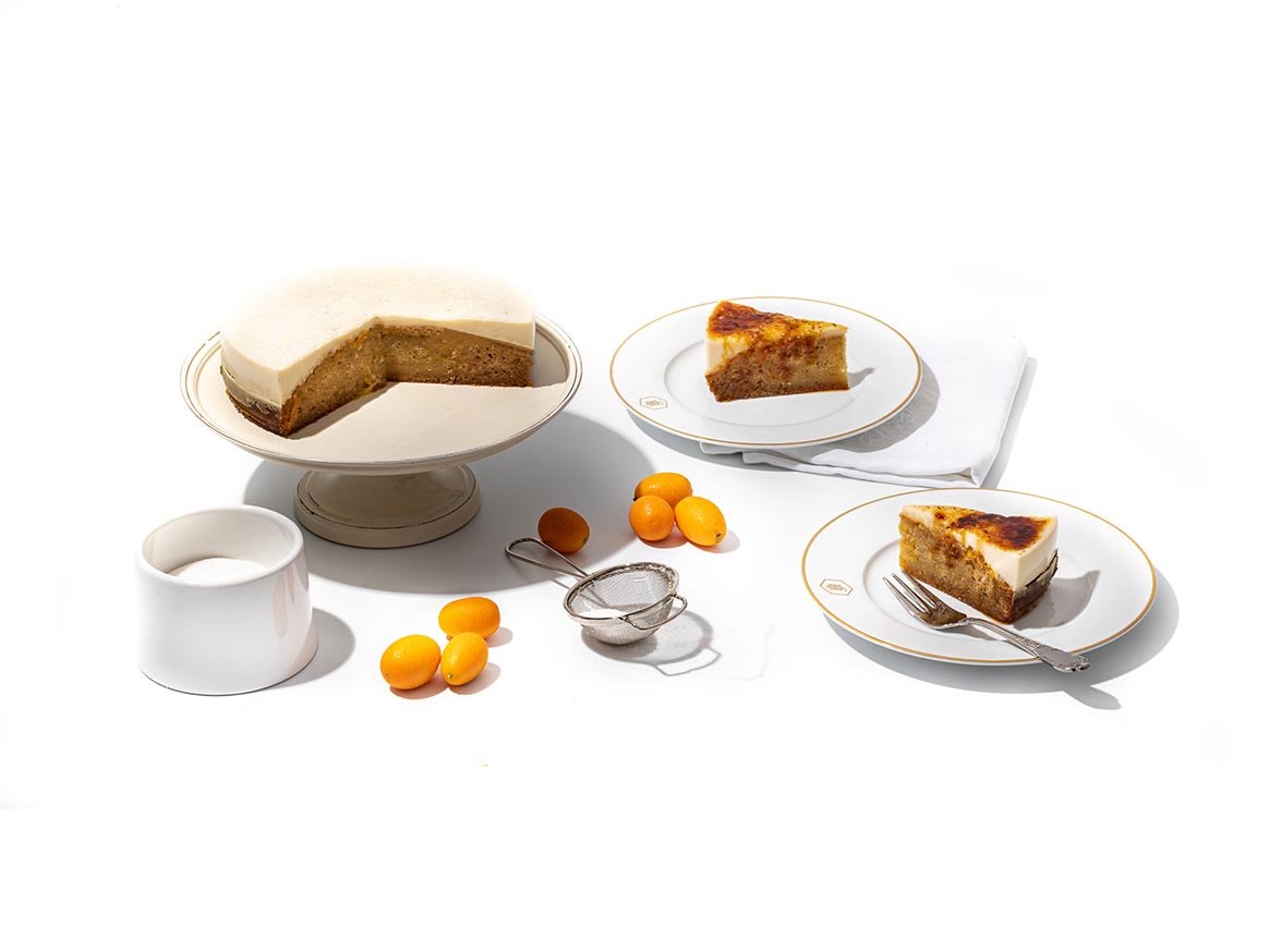 There’s always a reason to celebrate, especially the season. In summer, I can’t get enough of stone fruit and berries. But in winter, it’s all about citrus, and the more unusual the better. A kumquat never ceases to surprise me when its sweet nectar bursts into a sharp tang that finishes with a bite of bitterness – the perfect partner to a sweet, creamy dessert. I also love experimenting with sweet alternatives. There was a time when I thought the taste of maple syrup would overpower a dessert, but it’s a flavour that disappears into something like a cake, leaving you with a beautifully natural, balanced sweetness. What I loved about this cake was how interactive it ended up being, perfect for when you invite one of your more serious foodie friends over for coffee. We ended up brûlée-ing each slice after dishing it onto the plate! Maple Crème Brûlée Cake
