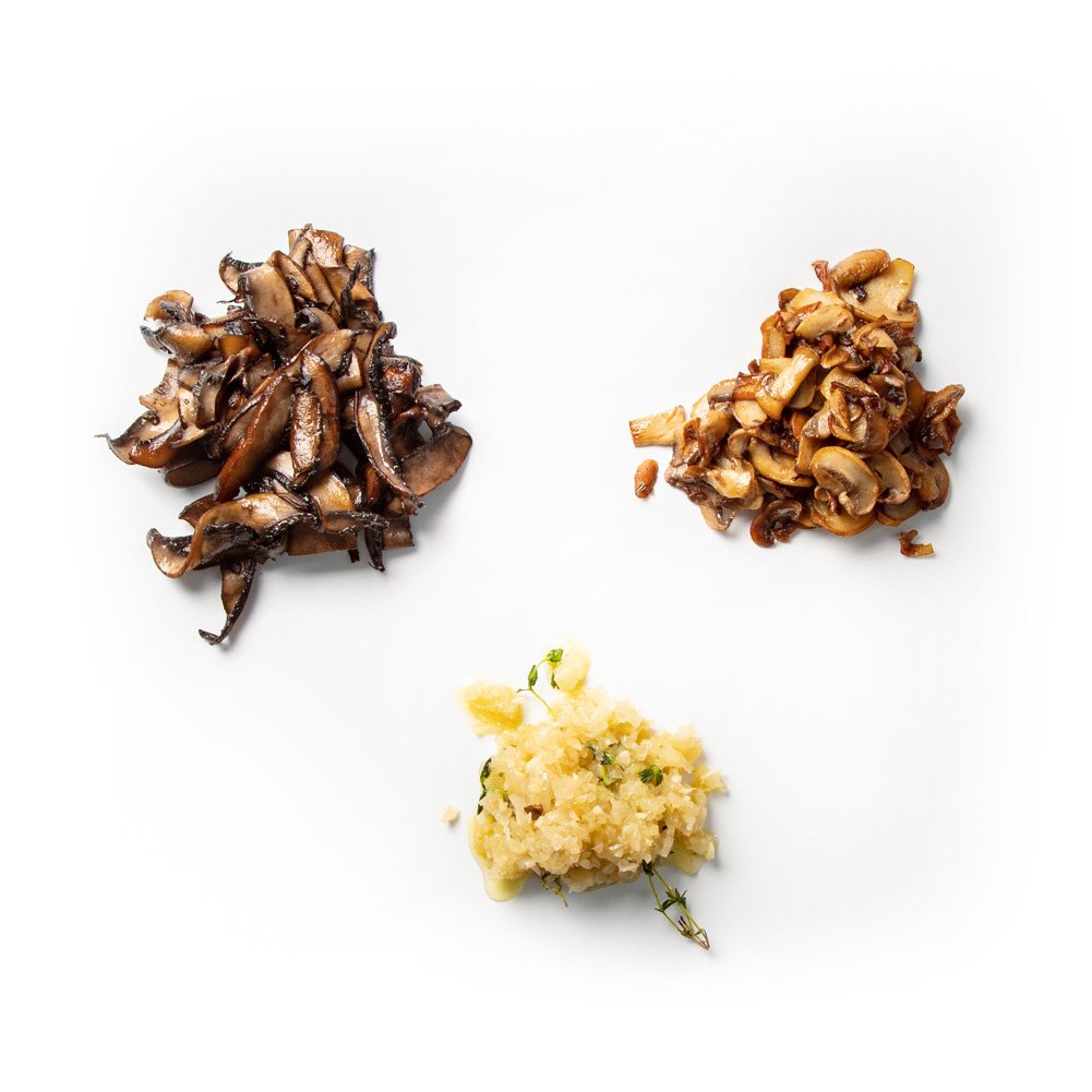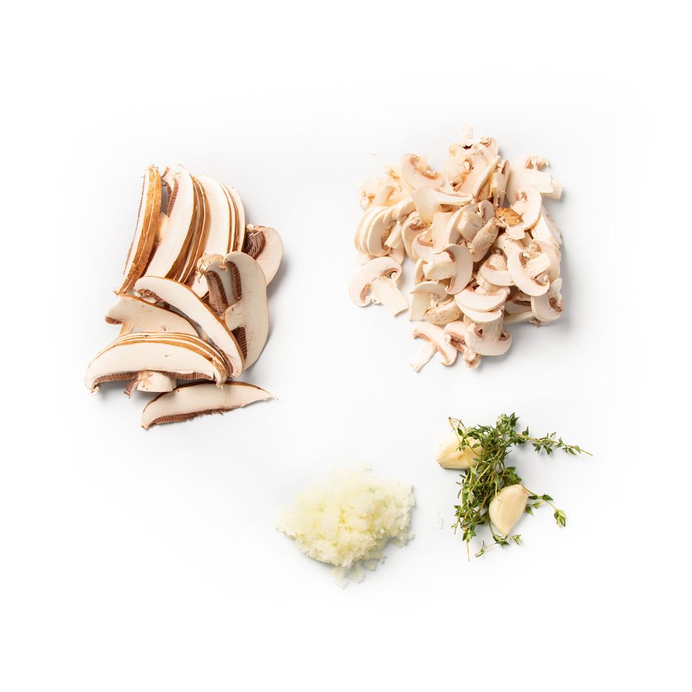 In the same frying pan, heat a little olive oil. Add the onion, garlic and thyme. Sauté until the onion is soft and translucent, then add it to the chopped mushrooms and mix well. Season with salt and pepper.