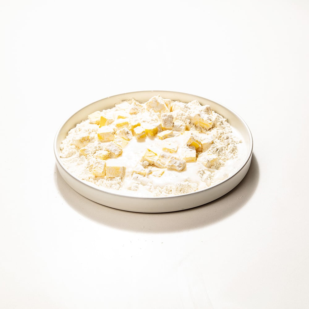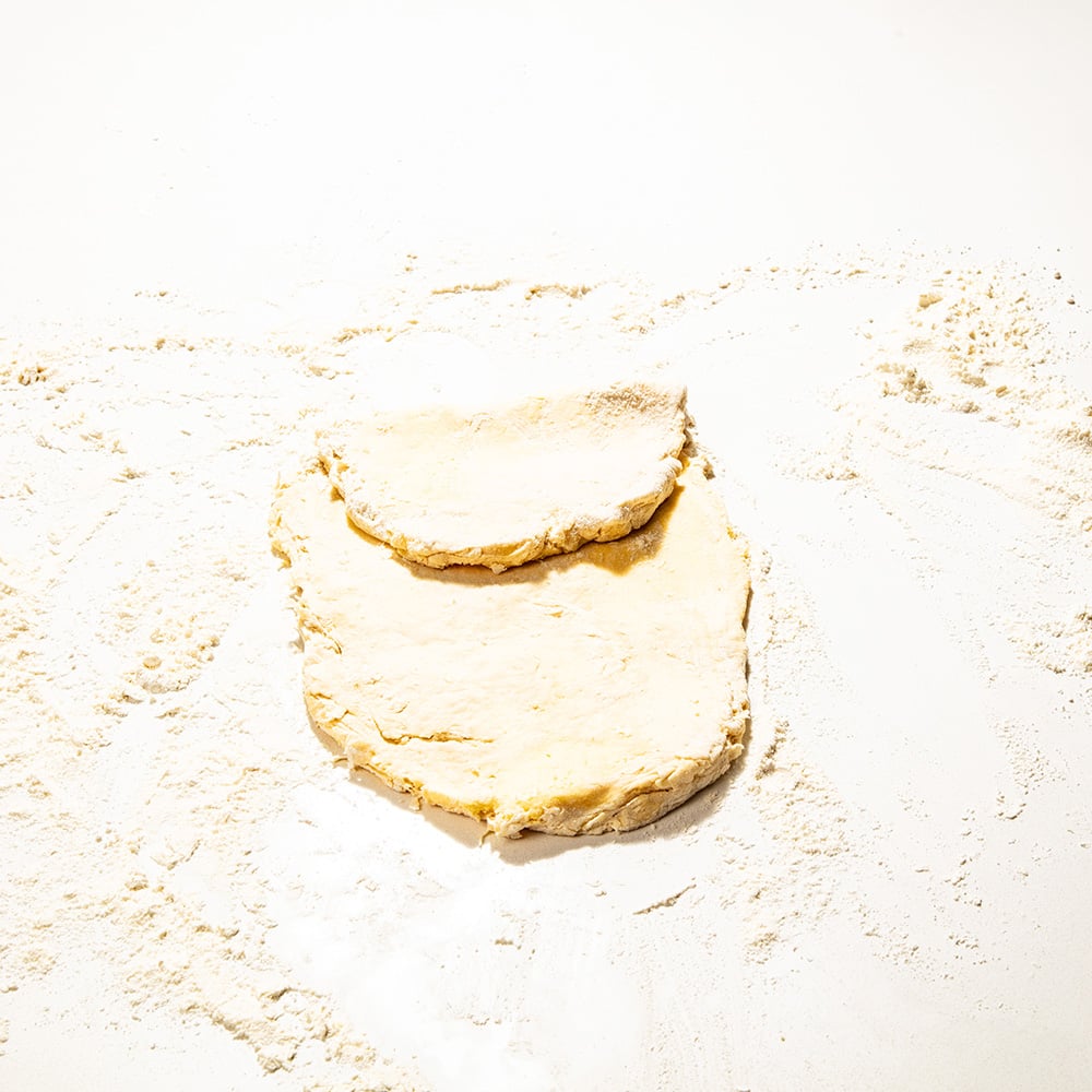 Place the flour and a large mixing bowl. Add the butter and toss it around in the bowl to make sure it’s well covered with the flour. Add the soda water and brandy and mix with the flour. I find it’s best to use your hands. If you find the mixture is a bit dry, add 15 ml more soda water. Once all the ingredients are well mixed, turn it out onto a floured surface.