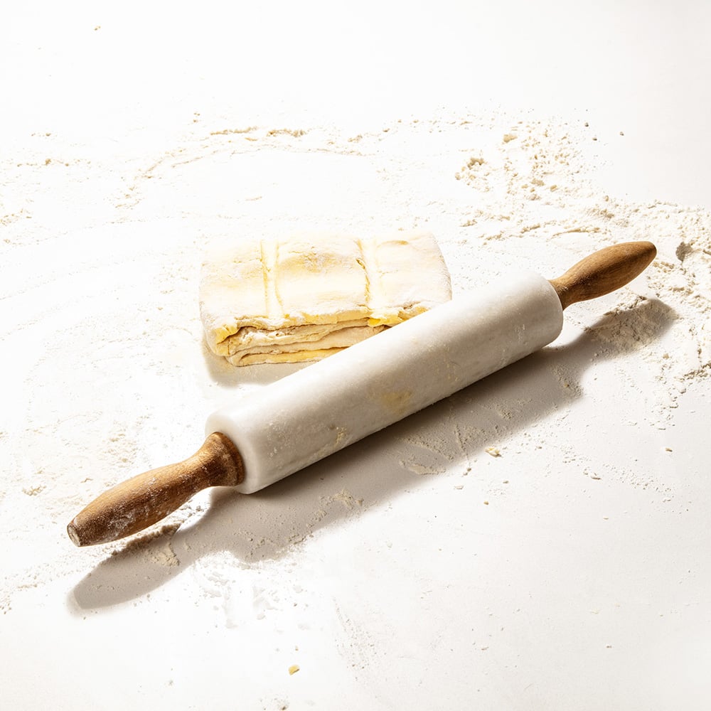 Then, fold the pastry like you’re closing a book and make horizontal indents in the pastry. This will give you an indication of how to roll out the pastry for the next step. Turn the pastry so that the indents are vertical, roll in one direction of the pastry again and repeat the folding process again.