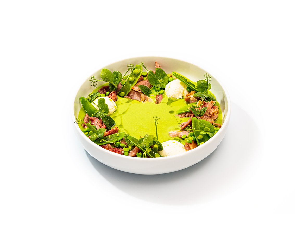 CHILLED PEA AND HAM SOUP WITH GOATS CHEESE MOUSSE