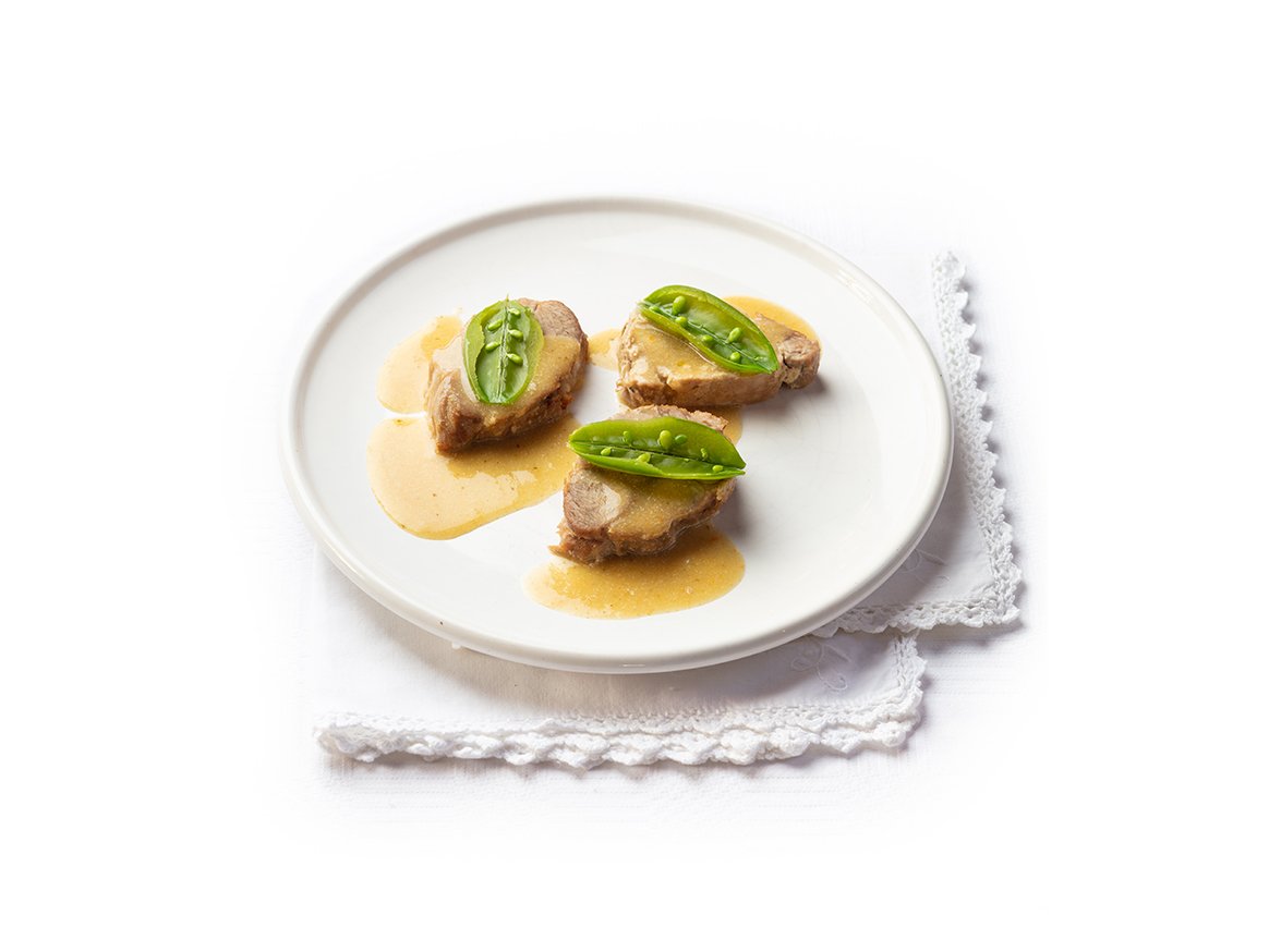 Slice the pork neck and serve with the sauce and sugar snap peas.