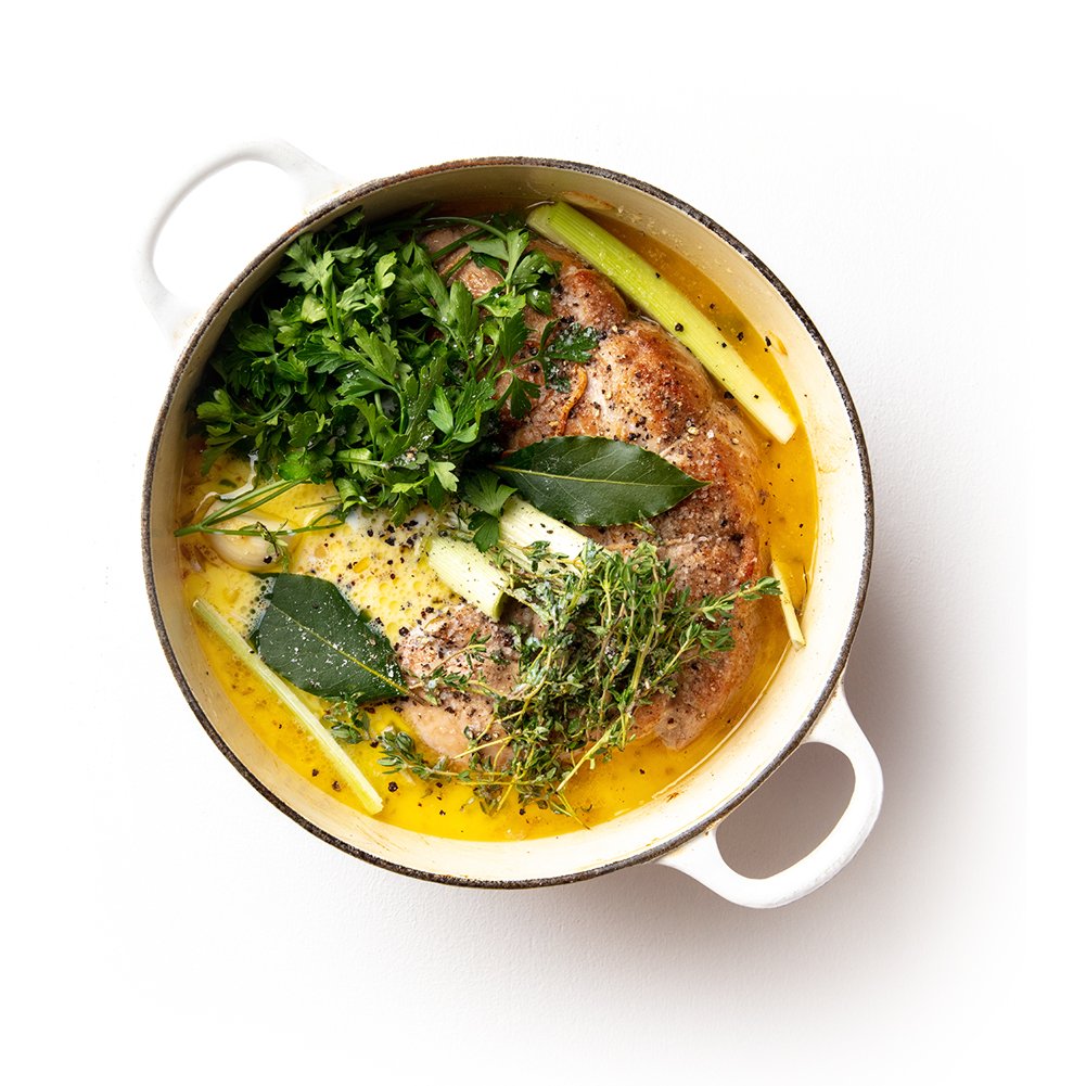 Place the pork neck on top of the vegetables and add the leeks, milk, parsley, thyme and bay leaves. Season with salt and pepper.