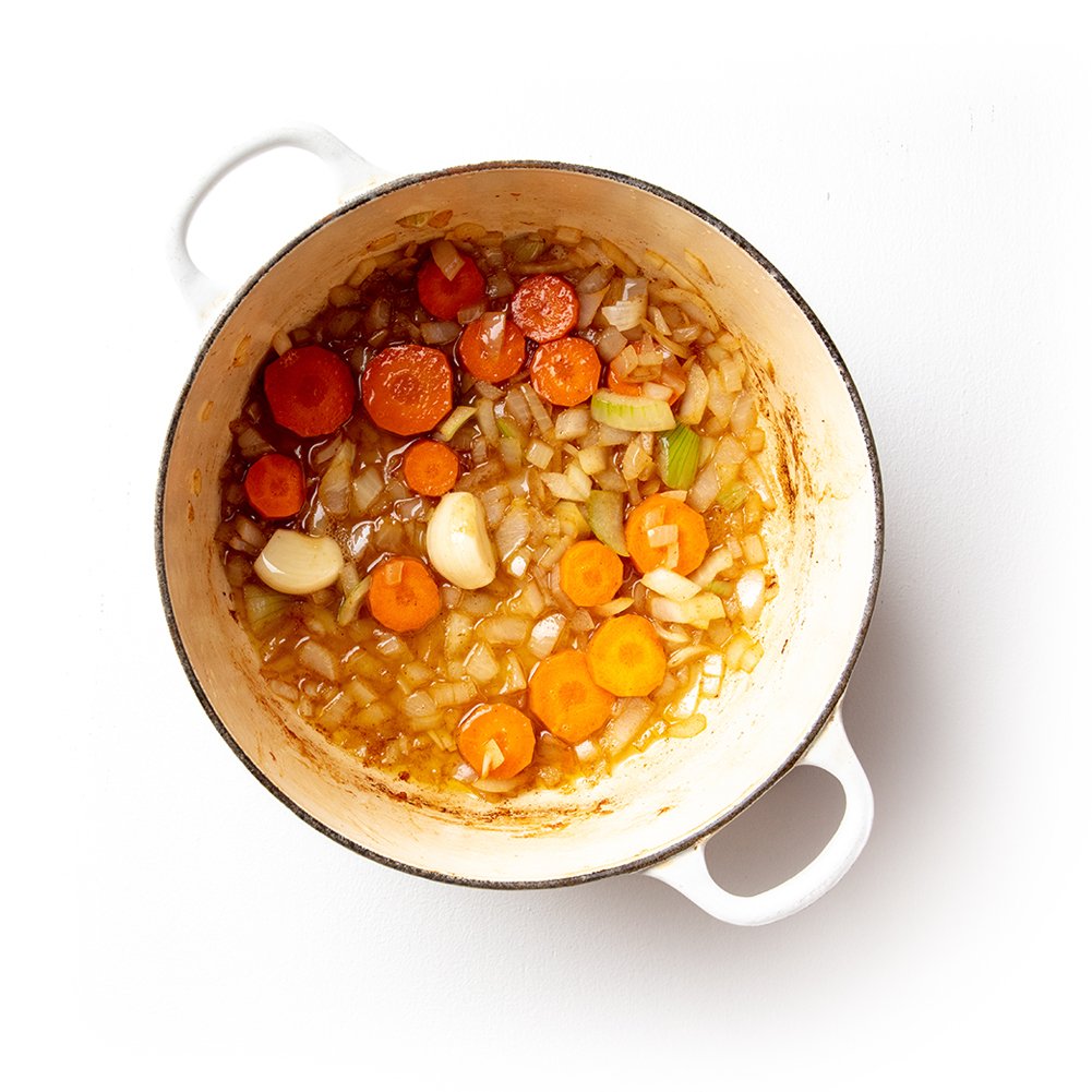 In the same saucepan, add the onion, carrot and garlic cloves. Fry until the onions is soft and translucent.
