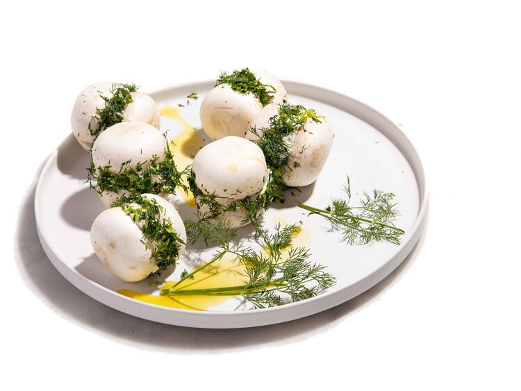 1. Mix the chopped dill and lime zest on a plate, then roll the mushroom in the mixture and arrange on a plate.