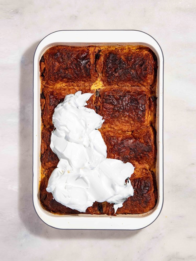 I won’t deny that I have a sweet tooth. Okay, maybe a few, but sickly sweet is not my thing. There comes a point with any flavour when your tastebuds just retreat in submission out of sheer overwhelm. Take, for instance, the bread-and-butter pudding. When it comes to stodgy desserts, there’s definitely something there, but good heavens, what a sweet mess! I mean, it’s basically layers of jam sandwiches drowning in a sweet custard. But what I find so great about this old poor man’s dessert from the British Isles is that it is so open to interpretation. There are no rules! So, to tone down the sweetness, I opted for a base of pain au chocolat (with a bittersweet chocolate filling) instead of jam sandwiches. What a homemade hit! And I love the fact that it comes with its own suggested portion sizes.