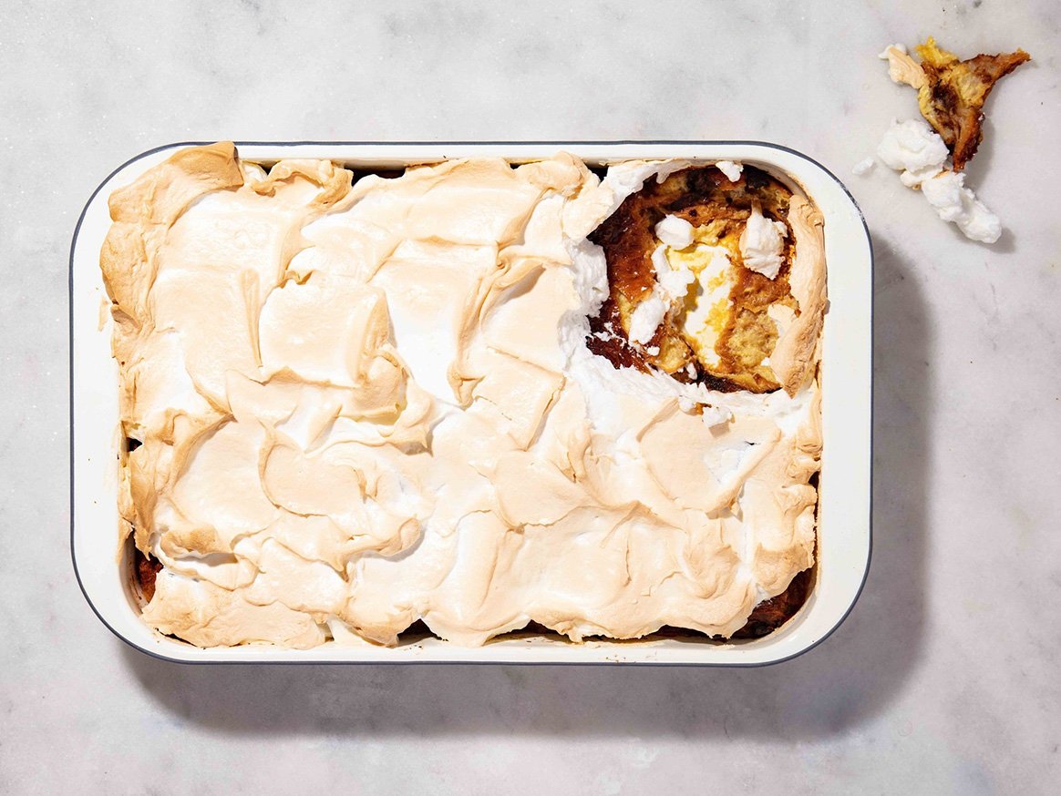 Preheat the oven to 180 °C. Butter a large oven dish and arrange the croissants in the dish. Beat the egg yolks, milk and 50 g of caster sugar together and pour over croissants. Let it soak for 30 minutes. Place the dish in the oven and bake for 30 minutes. Then, take it out and make your meringue topping. While beating the egg whites until they form soft peaks, add the caster sugar spoon by spoon, continuing to beat well. Spoon the meringue onto the pudding and place it back in the oven for about 15 minutes, until the meringue starts to brown. If you want a more crispy meringue, reduce the heat of the oven to 140 °C until the meringue is crispy. Touch the meringue to test it. Serve warm.