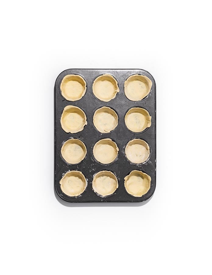Lightly dust the surface with cake flour. Place the puff pastry sheets on the floured surface. Use a rolling pin and gently roll out each sheet of puff pastry to a 2 mm thickness. Use the 9 cm round cutter and cut-out 12 discs from one sheet of puff pastry. Using a pastry brush, remove excess flour from the pastry. Line each muffin tray cavity and press down the bottom and sides to spread the puff pastry out.