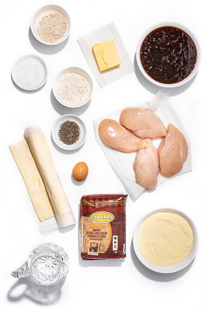 Layer the pies by adding a layer of cooked Spekko Brown Extra Long Grain Rice followed by pastorie chicken and repeat to create four alternating layers. Cover the pies with puff pastry lids by using the 7,5 cm round cutter to make disks from the second sheet of puff pastry. Use a fork to press down on the sides of the lids, making sure the pastry is sealed.