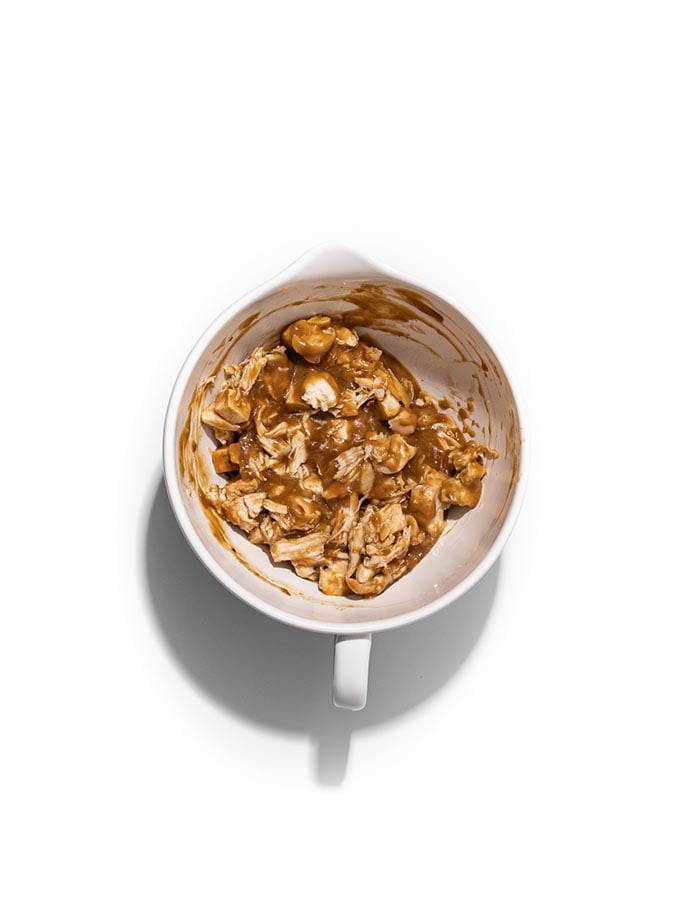 Prepare a 12-cup large muffin tin by spraying with non-stick cooking spray. Chop the chicken breasts or left-over chicken into small cubes and place in a bowl. Add the remaining sauce from the oven dish and mix through the chicken.