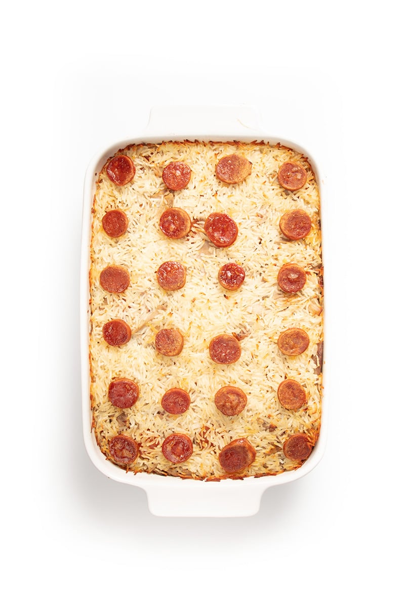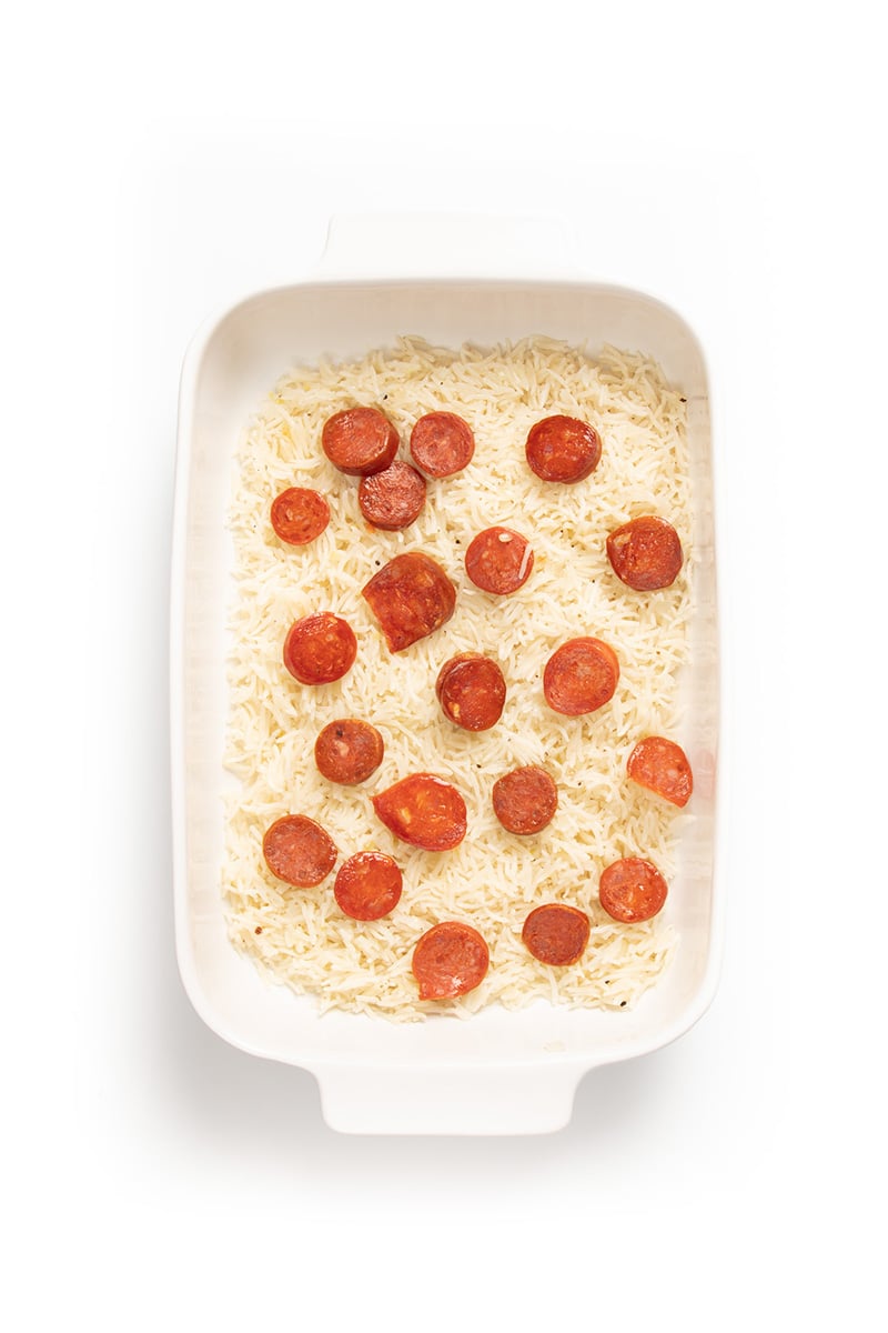 Spoon a layer of rice in a 30 x 20 x 6 cm oven dish. Top with chorizo and then shredded duck. Repeat this process two more times.