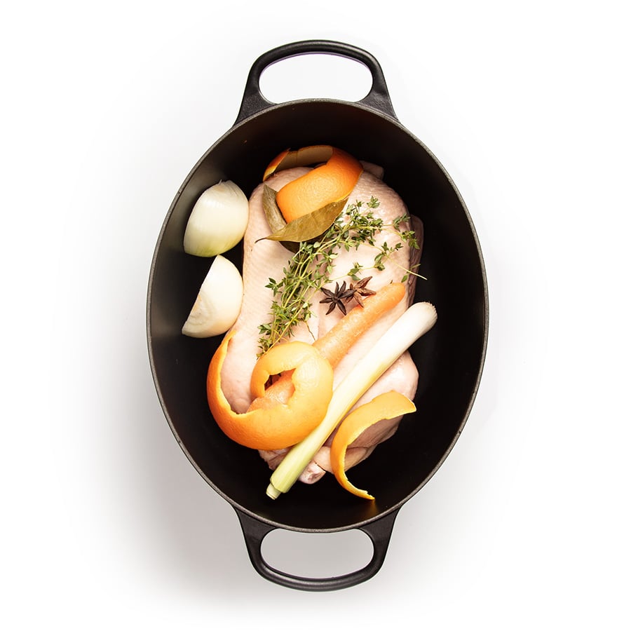 Place the duck in a large saucepan. Add the bay leaves, star anise, thyme, leek, carrot, onion and orange peel.