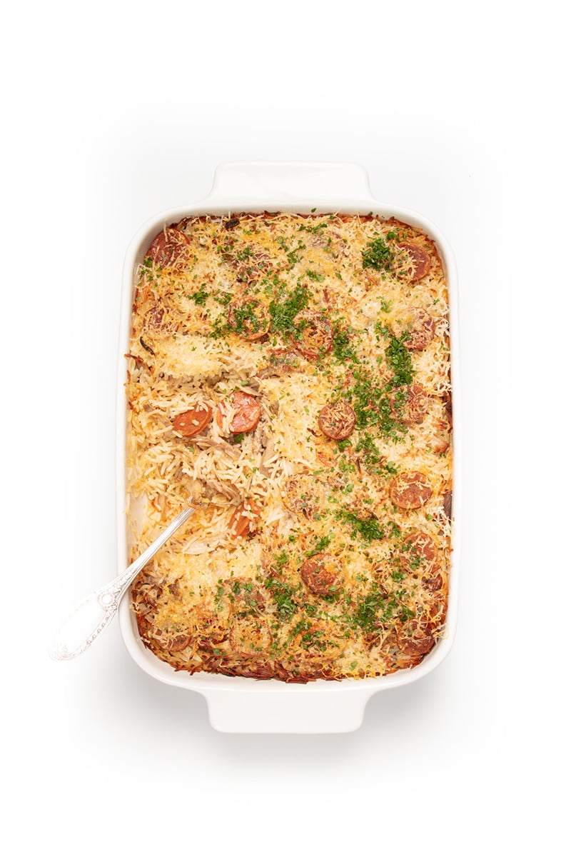 Spoon a layer of rice in a 30 x 20 x 6 cm oven dish. Top with chorizo and then shredded duck. Repeat this process two more times.