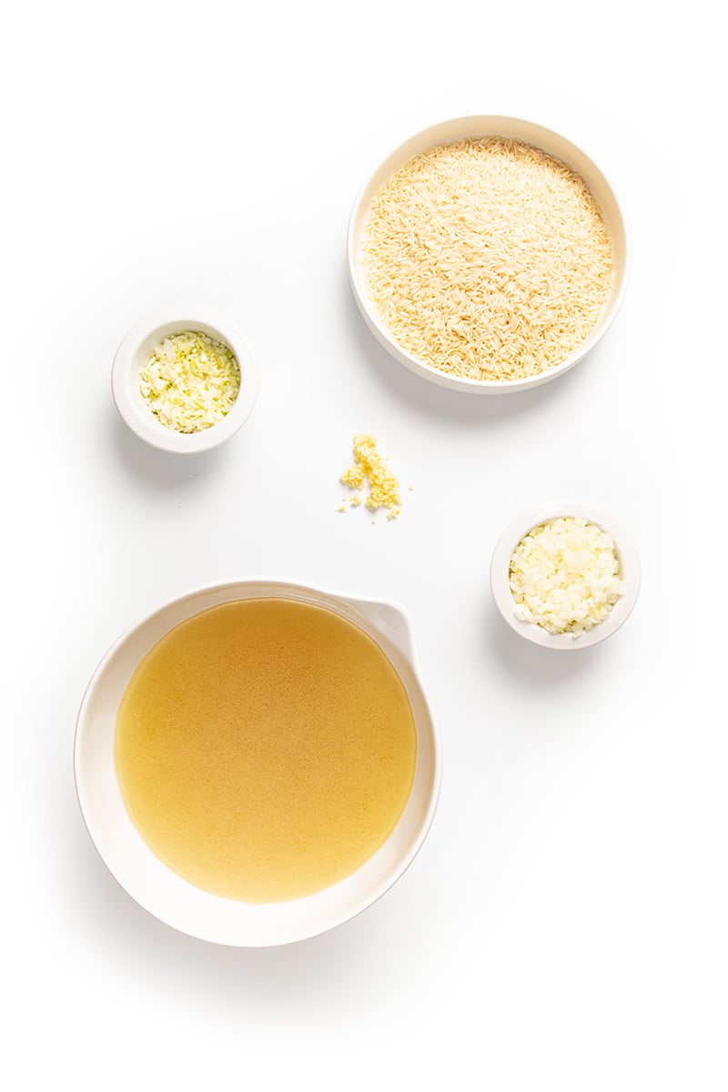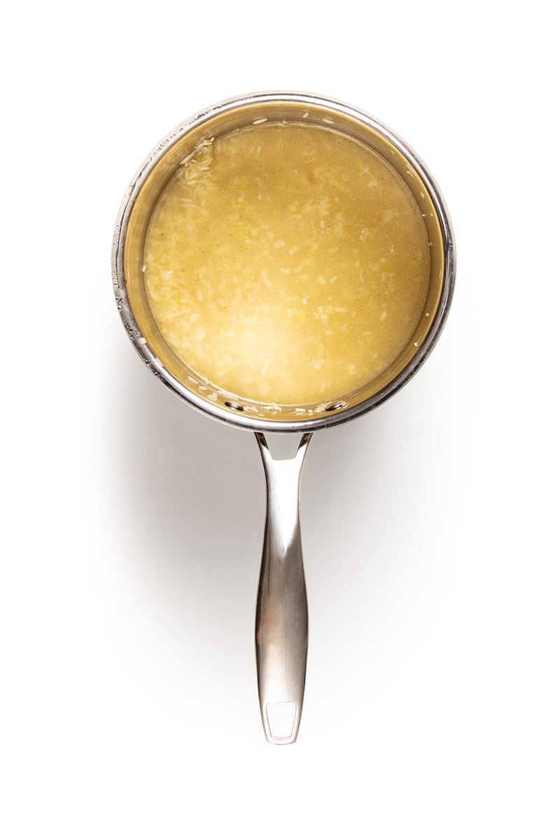 Measure 625 ml of the liquid and keep another 250 ml to one side, then add the liquid to the rice and season with salt and pepper. Cover with a lid and bring to a boil. Let it simmer for 5 minutes.
