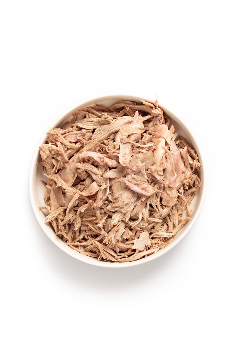 Strain the liquid through a sieve, then carefully remove the duck and the skin. Shred the meat of the carcass and keep to one side.