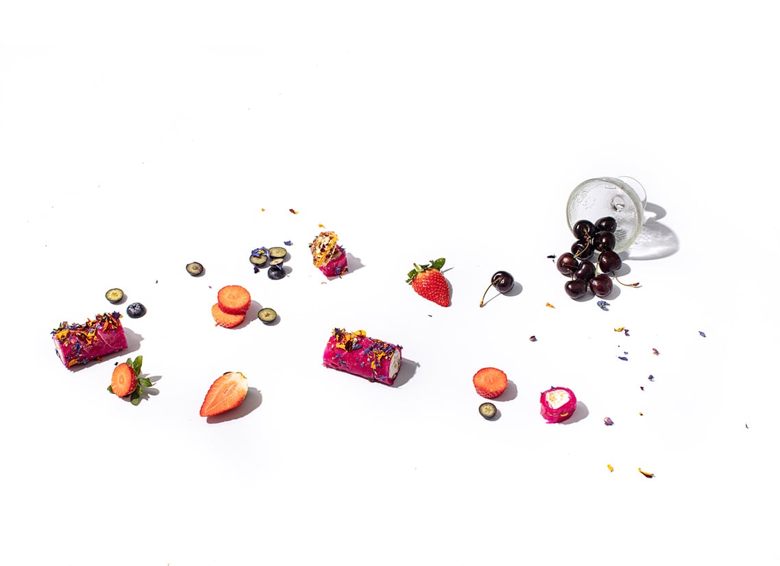 Slice the apple in half, lengthways, and start slicing thin slices of the apple to create a half-moon shape. Place the apple in a bowl with beetroot juice, and slice the beetroot in the same manner, ensuring the slices are paper thin. Remove the apple from the beetroot juice and remove excess liquid by placing it on a paper towel. Place the slices overlapping slightly on top of a muslin cloth, mixing between the beetroot and apple slice. Pipe the mousse in the centre and gently fold it over. Place in the freezer for 20 – 30 minutes to set slightly before slicing. Garnish with dried flower petals and fresh berries. Place the roulade on top of a bowl of Kellogg’s Crunchy Granola.