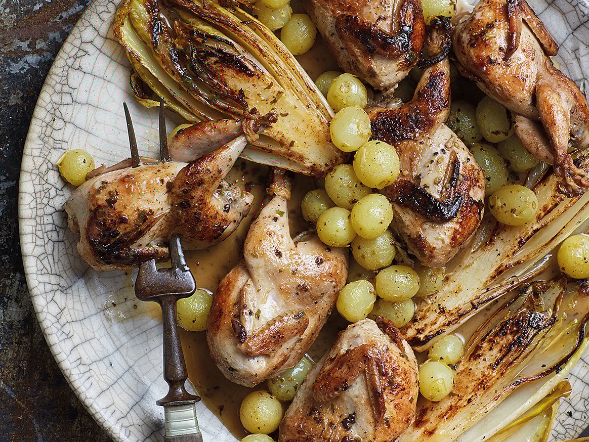 Melt the butter in a large, deep frying pan and brown the quails on all sides. Season with salt, pepper and tarragon. Add the wine and bring to a boil. Let it boil for 1 minute, then add the stock and grapes. Cover the pan and simmer for 10 minutes, or until the quails are cooked. Spoon out the quails and grapes, and keep warm. Boil the sauce until reduced to two thirds. Melt the 50 g butter in a separate pan and place the chicory halves in the pan, cut side down. Fry both sides until brown. Arrange the quails, grapes and chicory on a serving plate and pour over the sauce.