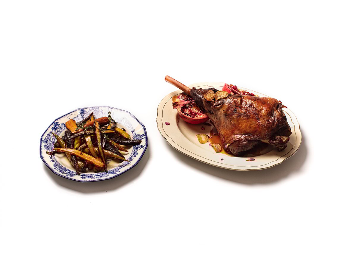 ROAST LEG OF LAMB WITH POMEGRANATE AND BABY CARROTS