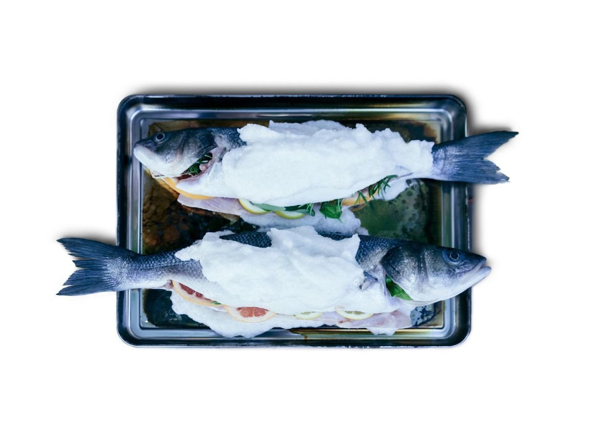 Lay the fish down on the bed of salt, using the remaining salt mix, cover the entire fish pressing down firmly.