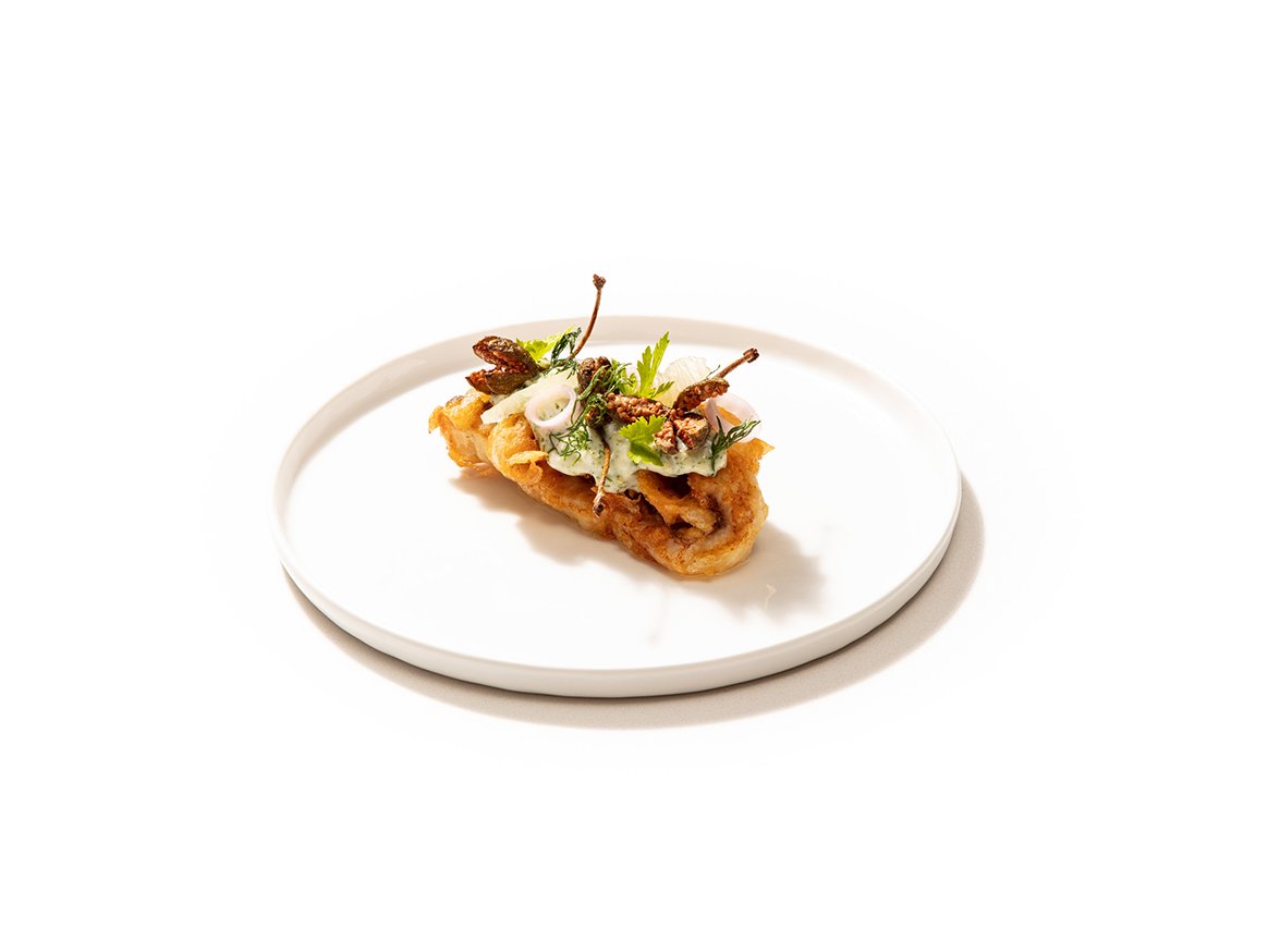 Place a beer battered fillet of fish on a plate. Spoon about 20 ml tartar sauce onto each fillet. Garnish with the crispy caper berries, lemon segments, dill, parsley and shallot rings.