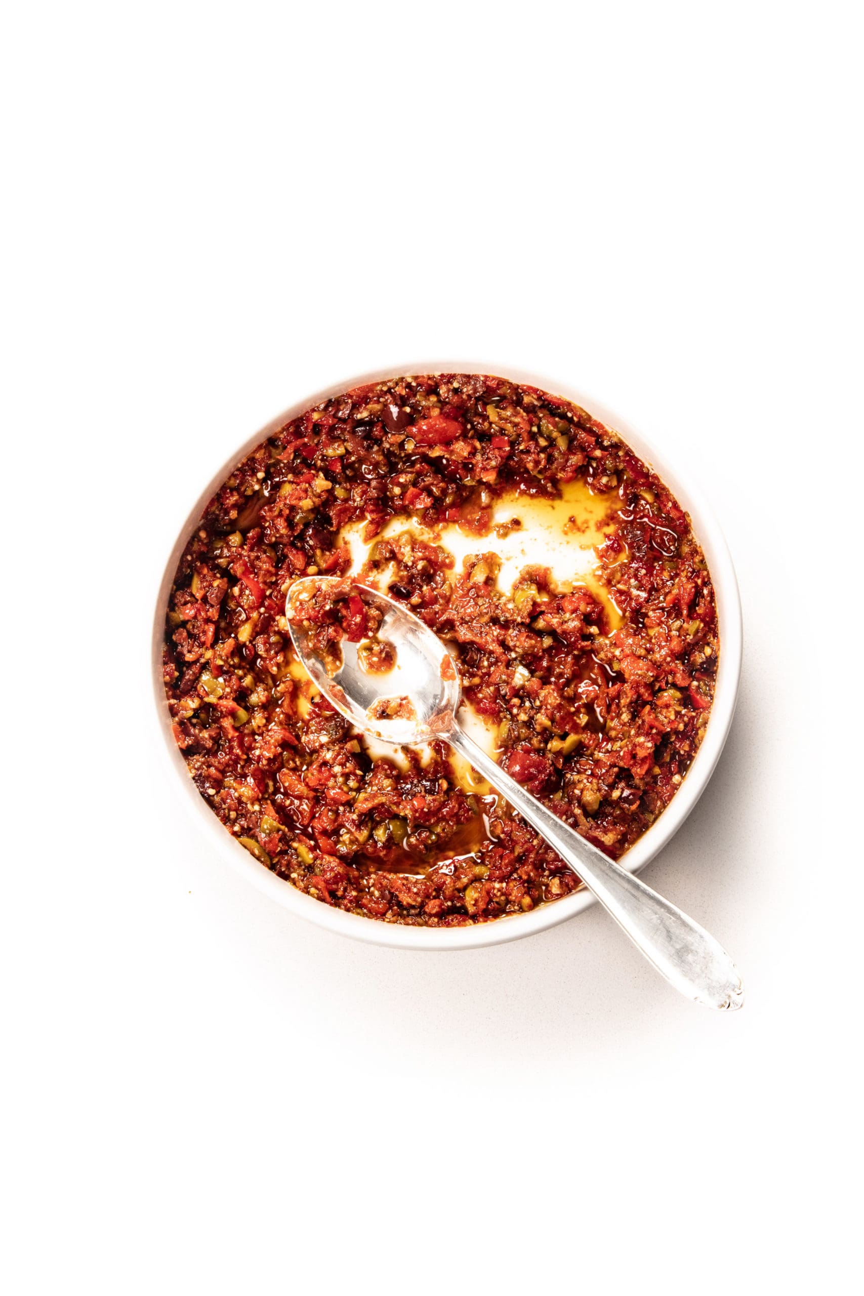 Remove the stems from the caper berries. Finely chop the caper berries, tomatoes, green olives, black olives, peppercorns, piquanté peppers and grilled peppers.