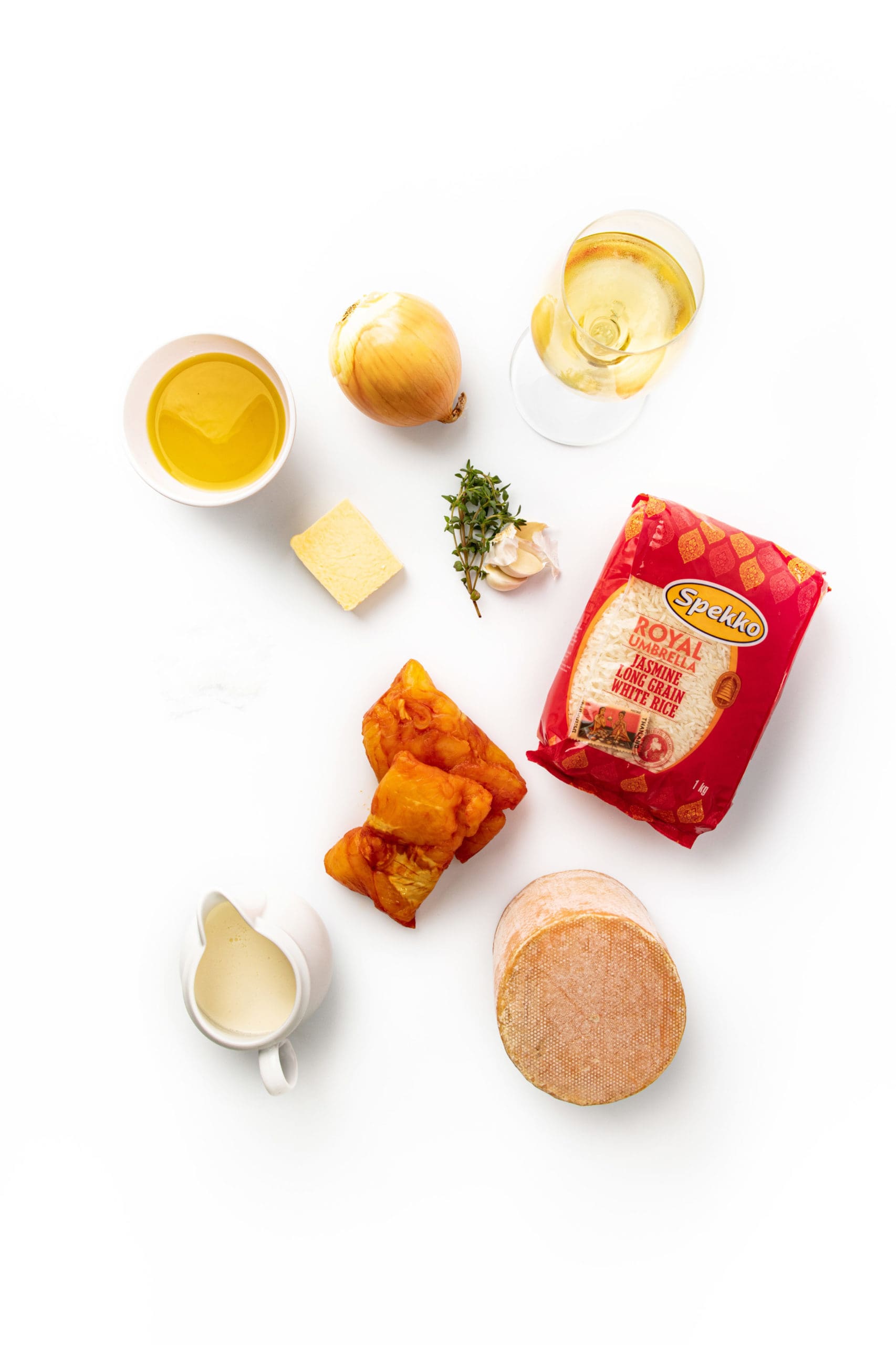 Place a saucepan over a medium heat. Add the olive oil and butter into the saucepan. Once the butter is melted, add in the sliced onion, garlic and thyme. Leave to sauté on a low heat until the onions are soft and translucent an have obtained no colour. Add the wine and allow to reduce to a third before adding in the smoked haddock.