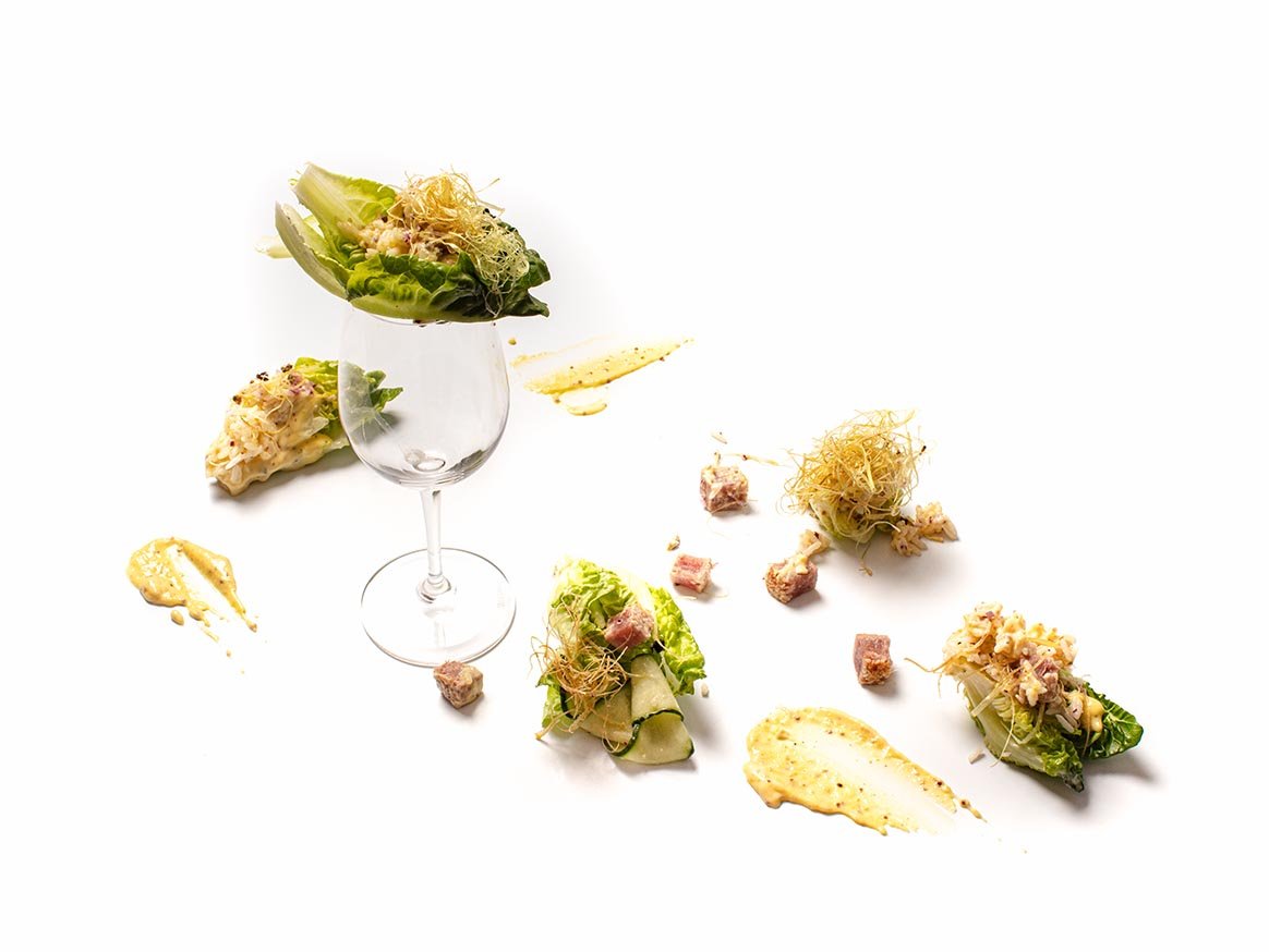 Layer the hollowed-out eggshells by placing the rice mixture at the bottom, followed by tuna portions (removed from marinade), and alternate between the two, serve with grilled gem lettuce.