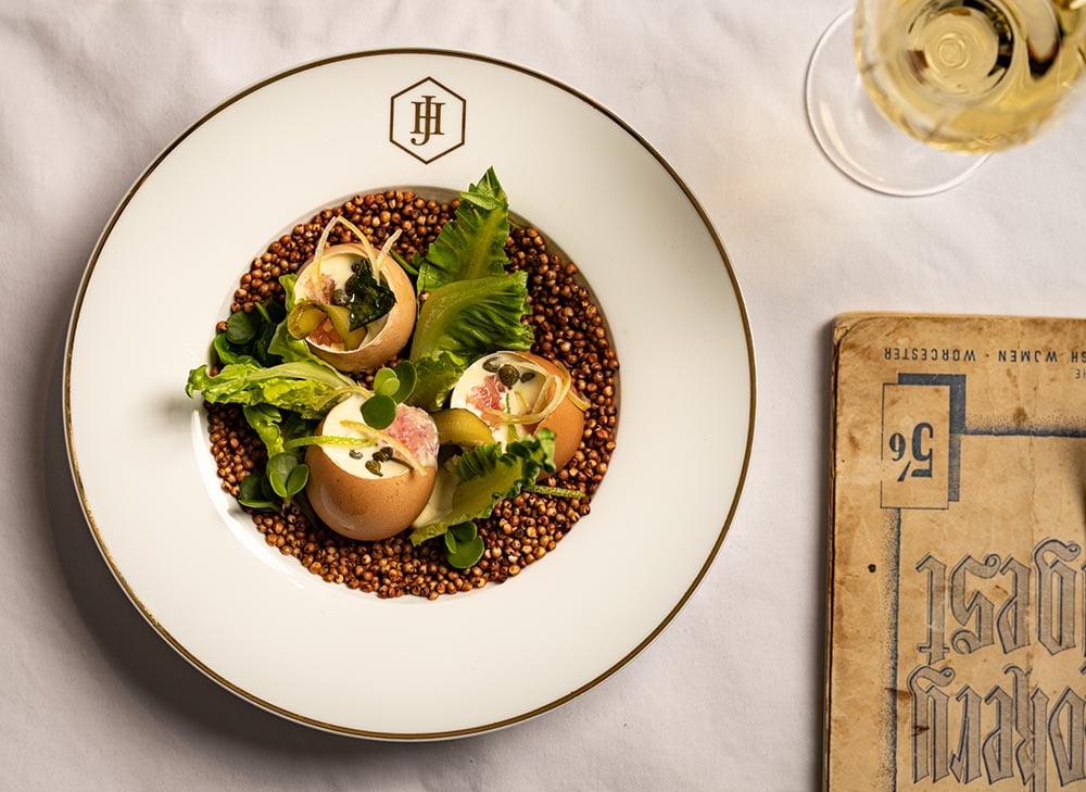 Use an eggshell topper to remove the top part of the shell, gently pour the eggs into a bowl and boil the emptied eggshells in a pot of water for 3 minutes, gently remove the thin membrane on the inside of the shell and keep the yolks for the mayonnaise (optional)