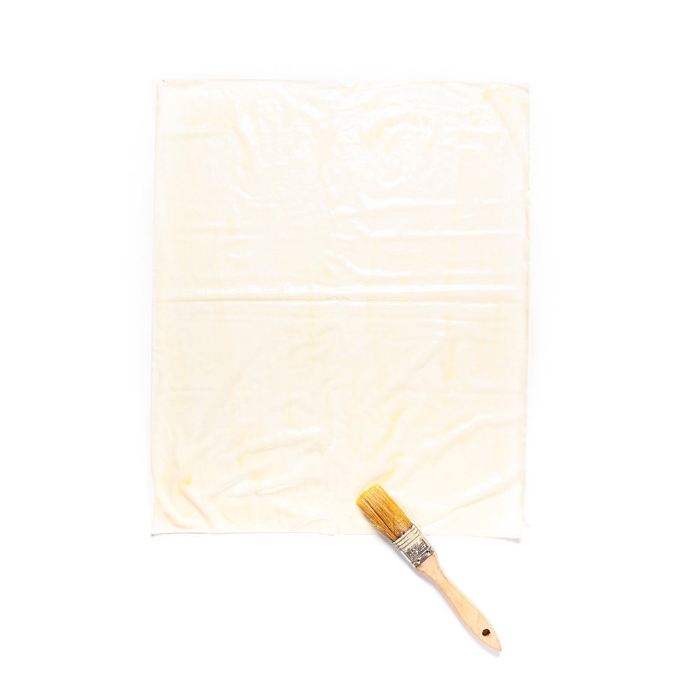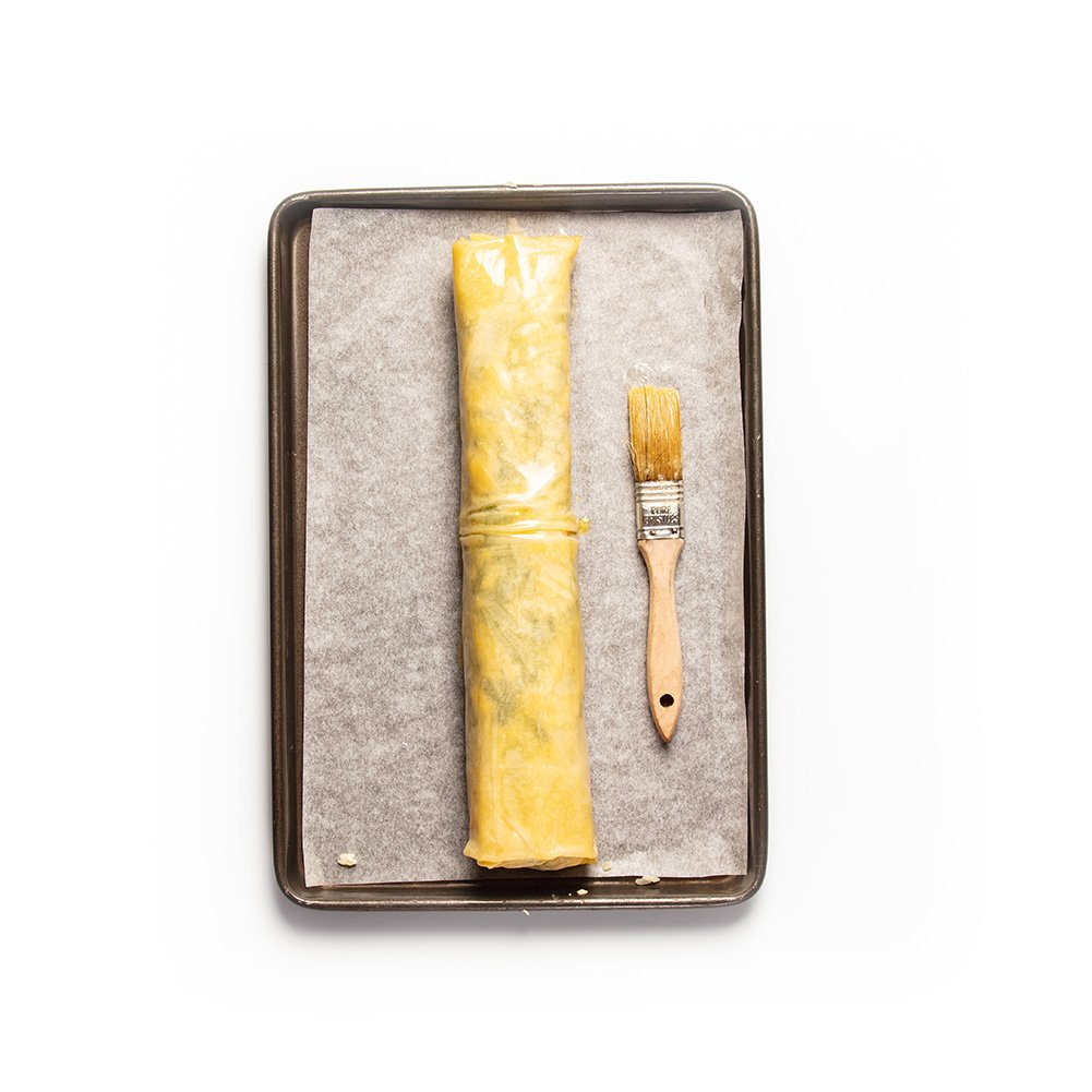 Place one sheet of phyllo pastry on your work surface and brush with melted butter. Place another sheet of phyllo pastry on top and repeat with the last sheet pastry. Remember that phyllo pastry dries out very quickly, so when you are not using the pastry, cover it with a dampened kitchen cloth.