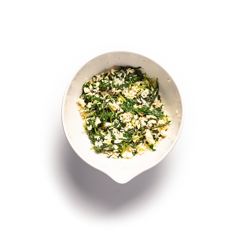 Place the rice, fried onion, spinach and feta cheese in a mixing bowl. Add the egg and season with salt and pepper. Mix well.