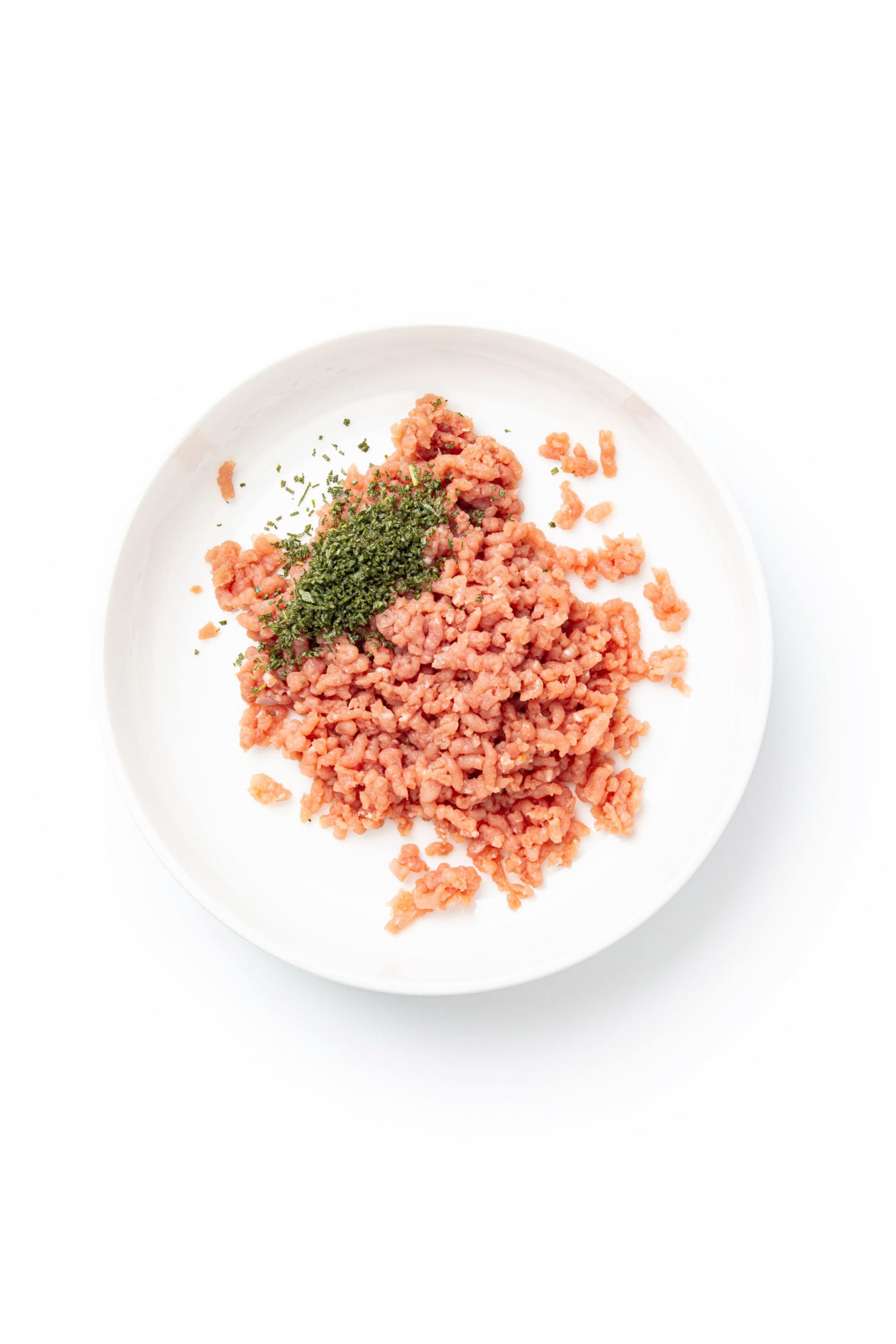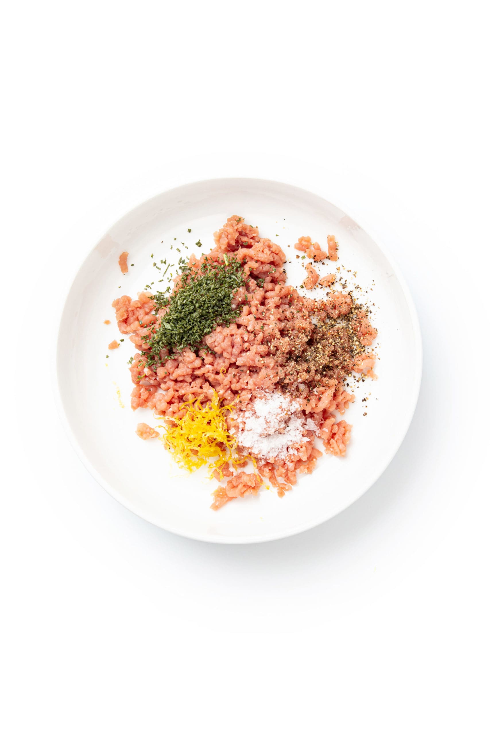 Heat the oven to 180 °C. Place the pork mince in a mixing bowl. Add the chopped sage and then the lemon zest. Season with salt and pepper. Mix well and keep to one side.