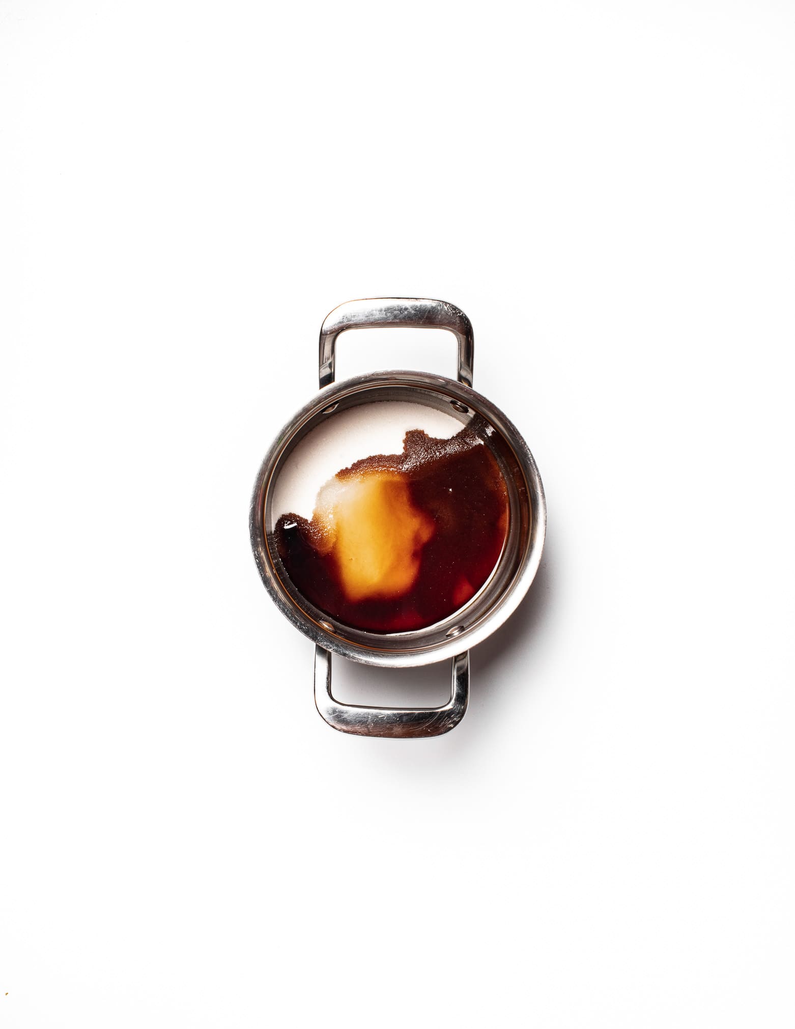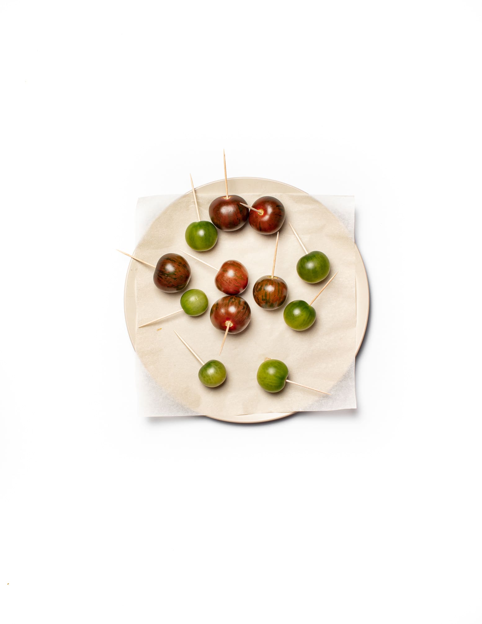 Place the sugar, water and balsamic vinegar in a saucepan on medium heat. Allow the sugar to melt slowly. Stir until it reaches a caramel consistency. Press a toothpick into the top of each tomato (you’ll replace the toothpicks later with lemon tree twigs).