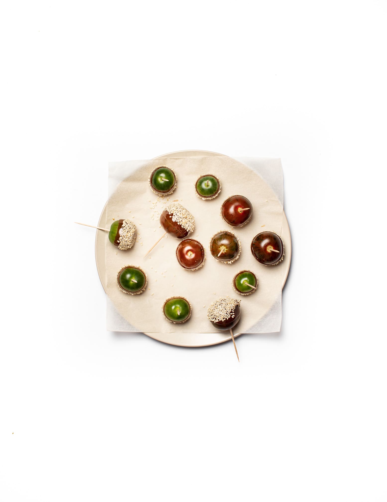 Remember those toffie appels we used to get at school fêtes and church bazaars? I loved them, despite the fact that I can still hear my mother saying, “You’ll lose a tooth eating that.” Which got me thinking… what if you could turn the toffee apple into a beautiful amuse-bouche? A perky little appetiser to awaken your taste buds. Well, never underestimate a tomato for its ability to straddle that tricky midway between sweet and savoury. By all accounts, this should be a sweet treat, but you can get away with serving it as a canapé because… tomatoes! The sesame-seed crust just adds that extra layer of satisfactory crunch.