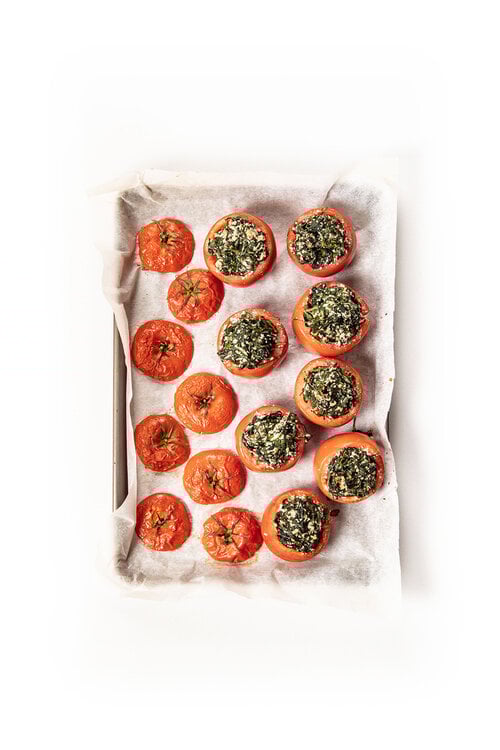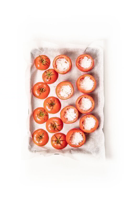Spoon the rice into the hollowed-out tomatoes (about halfway full). Place the tomatoes and the cut-off tops on a baking tray that is lined with baking paper.