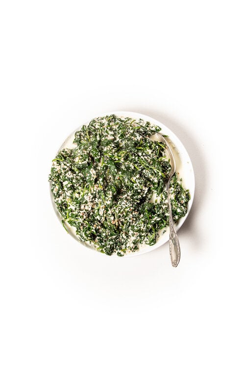 Rinse the spinach in a colander. Heat a non-stick frying pan and let the spinach wilt in the pan. Add the almond cream to the wilted spinach and let it cook for 1 minute.