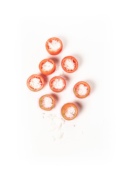 I’m not going to pretend to be vegan, but the plant-based food world is far too exciting to ignore. While I’m not into processed substitutes, I do love exploring the many uses of ingredients like almonds, or how something as simple as a tomato transforms into a sophisticated side dish with just that extra bit of effort. For these spinach-stuffed tomatoes, I made an almond cream instead of falling back on the usual dairy cream. I find it makes the dish just that little bit lighter while adding a rich, nutty flavour to the filling. But don’t forget the “cherry on top” (yes, I just said that). A garnishing of miniature tomatoes, like these Romanitas, adds that satisfying sharpness that brings all the textures and flavours in these beauties together.