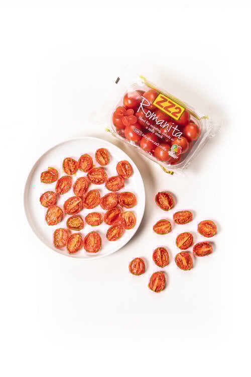 Heat the oven to 100 °C. Halve the Romanita tomatoes and place them on a baking tray lined with baking paper. Roast them in the oven for 1 hour.