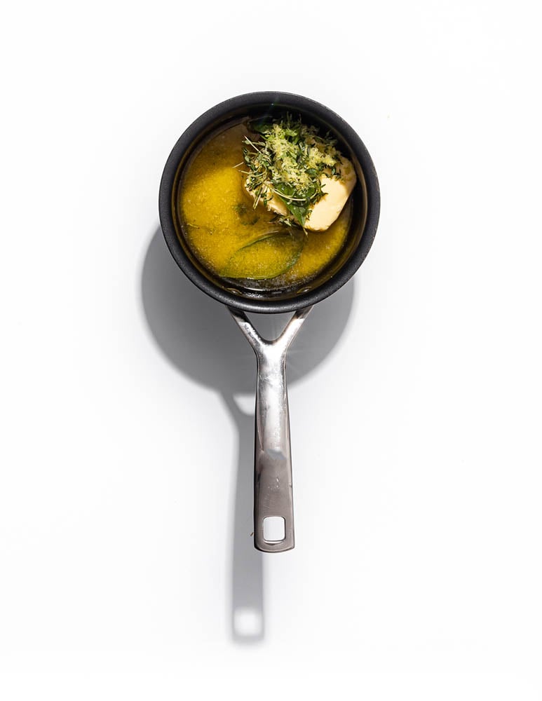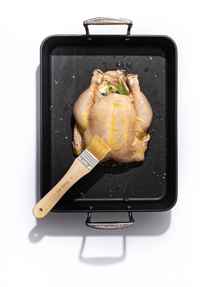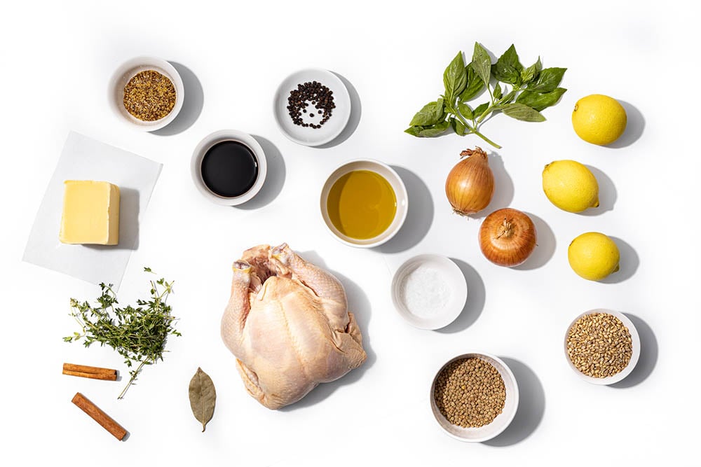 Preheat the oven to 180 °C. Place butter, half of the herbs and the zest of one lemon in a small saucepot and melt over a low heat. Slice 1 lemon into quarters and place the lemon wedges, bay leaf, 3 basil leaves and remaining thyme in the cavity of the whole chicken. Place the chicken in a roasting tray and generously brush with the infused butter. Roast the chicken in the oven for 30 minutes and brush with more of the infused butter, roast for another 30 minutes and brush again. Turn the oven temperature to 200 °C and roast for another 10 minutes before removing it from the oven. Ensure the chicken is cooked thoroughly.