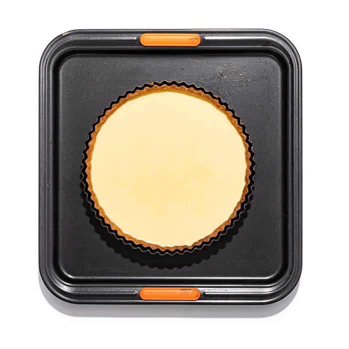 Once the dough is ready, roll out and line a 23cm quiche tin. Place in the freezer for about 20 minutes before baking. While resting in the freezer, heat the oven to 190°C. Blind bake for 15 minutes and allow to cool before placing the filling inside the tart shell.