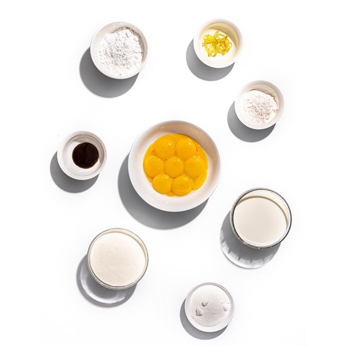 Heat the cream, milk, and vanilla together in a large saucepan until it starts to simmer. Whisk together the sugar, egg yolks, custard powder, and lemon zest in a bowl, and temper the eggs by slowly pouring about one cup of the warm milk and cream into the eggs while whisking. Add the mixture back into the pot and cook until it reaches a thick, custardy consistency. Strain through a sieve and place the mixture in the baked tart shell, once cooled down. Bake the tart at 190°C for 50 minutes to 1 hour.