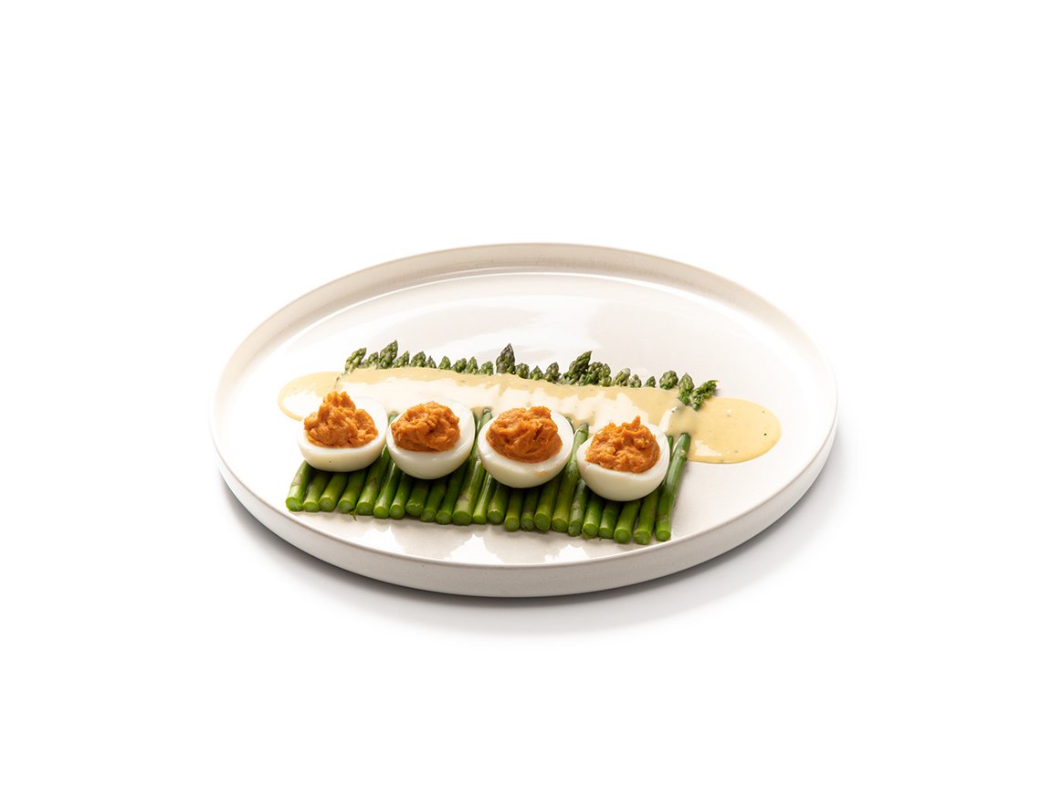 Arrange the asparagus on serving plates and place the Deviled Eggs on top.