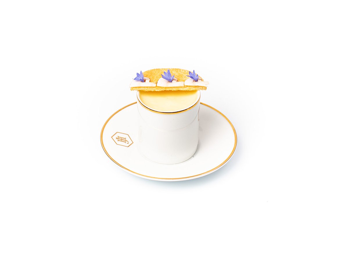 Spoon the mushrooms into small espresso cups. Place an egg yolk on top and season with salt. Fill the cup with the bacon hollandaise. Place a half circle toast on top of each cup and garnish with thinly sliced mushrooms and edible flowers. Enjoy!
